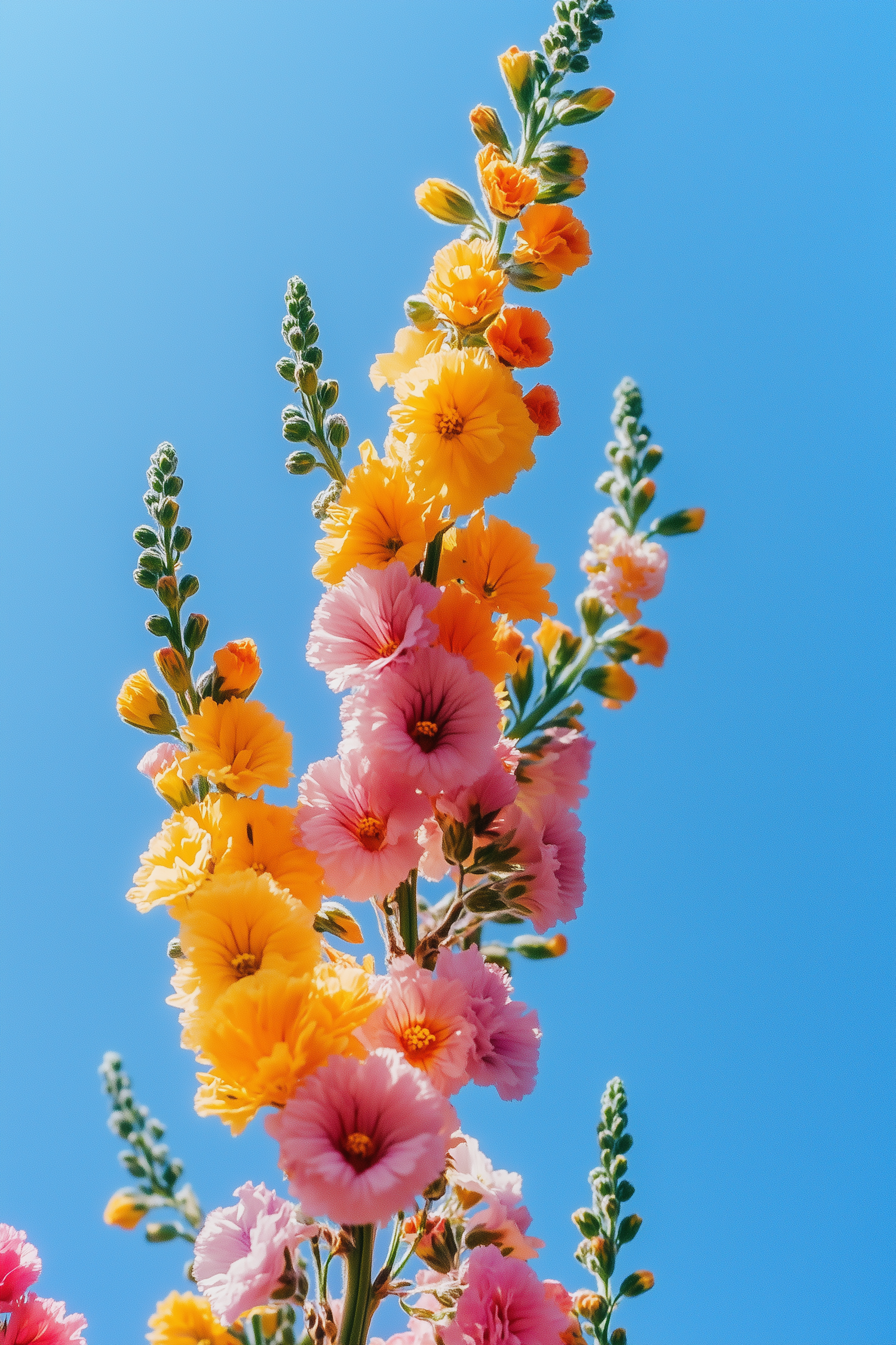 Bright yellow and pink flowers bloom against a clear blue sky, creating a vibrant and cheerful nature scene.