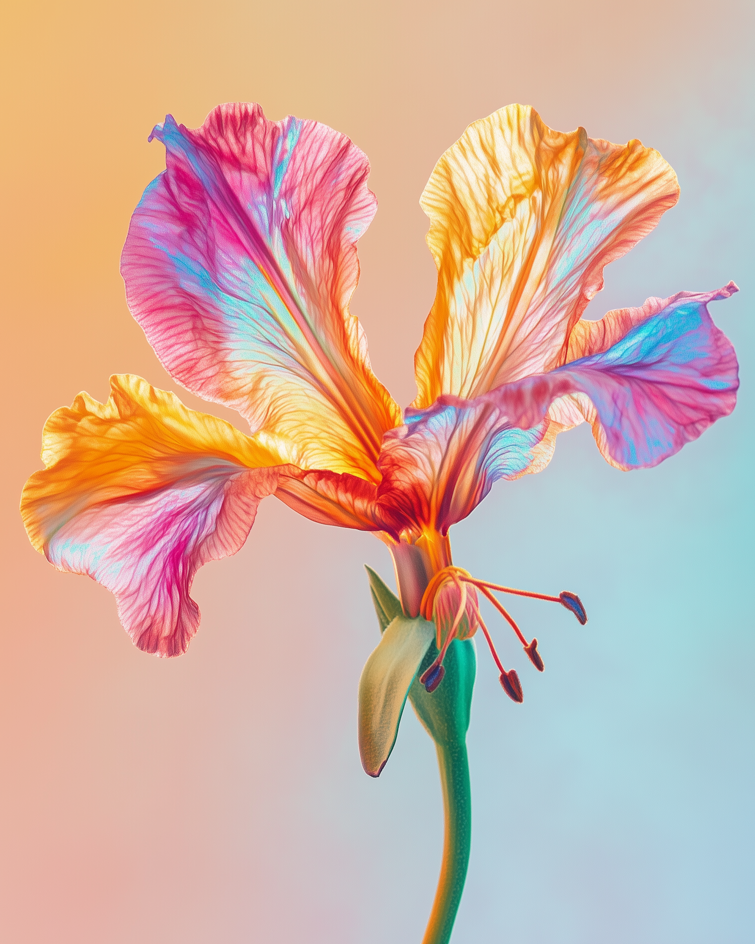 A vibrant flower with translucent petals in pink, orange, and blue hues against a pastel gradient background.