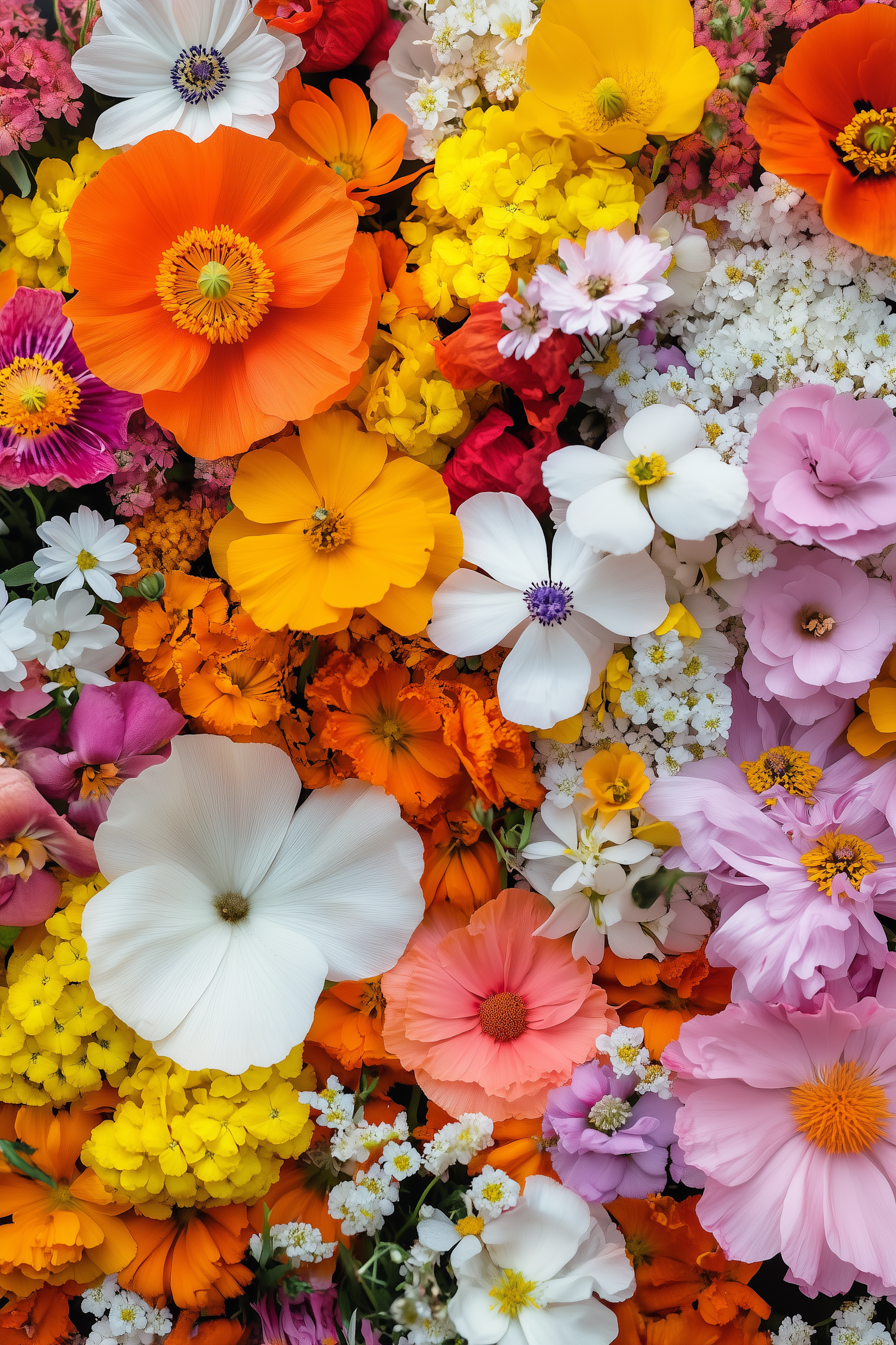 A vibrant mix of colorful flowers, featuring bright oranges, yellows, whites, and pinks, creating a lively and cheerful display.