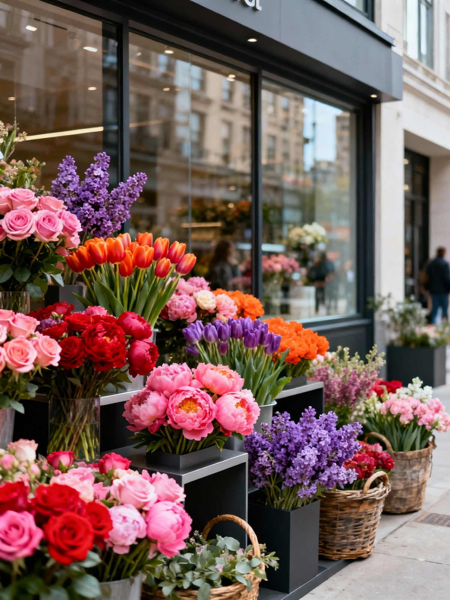 A vibrant flower shop display with colorful roses, tulips, and lilacs arranged in baskets and vases, set against a modern urban backdrop.