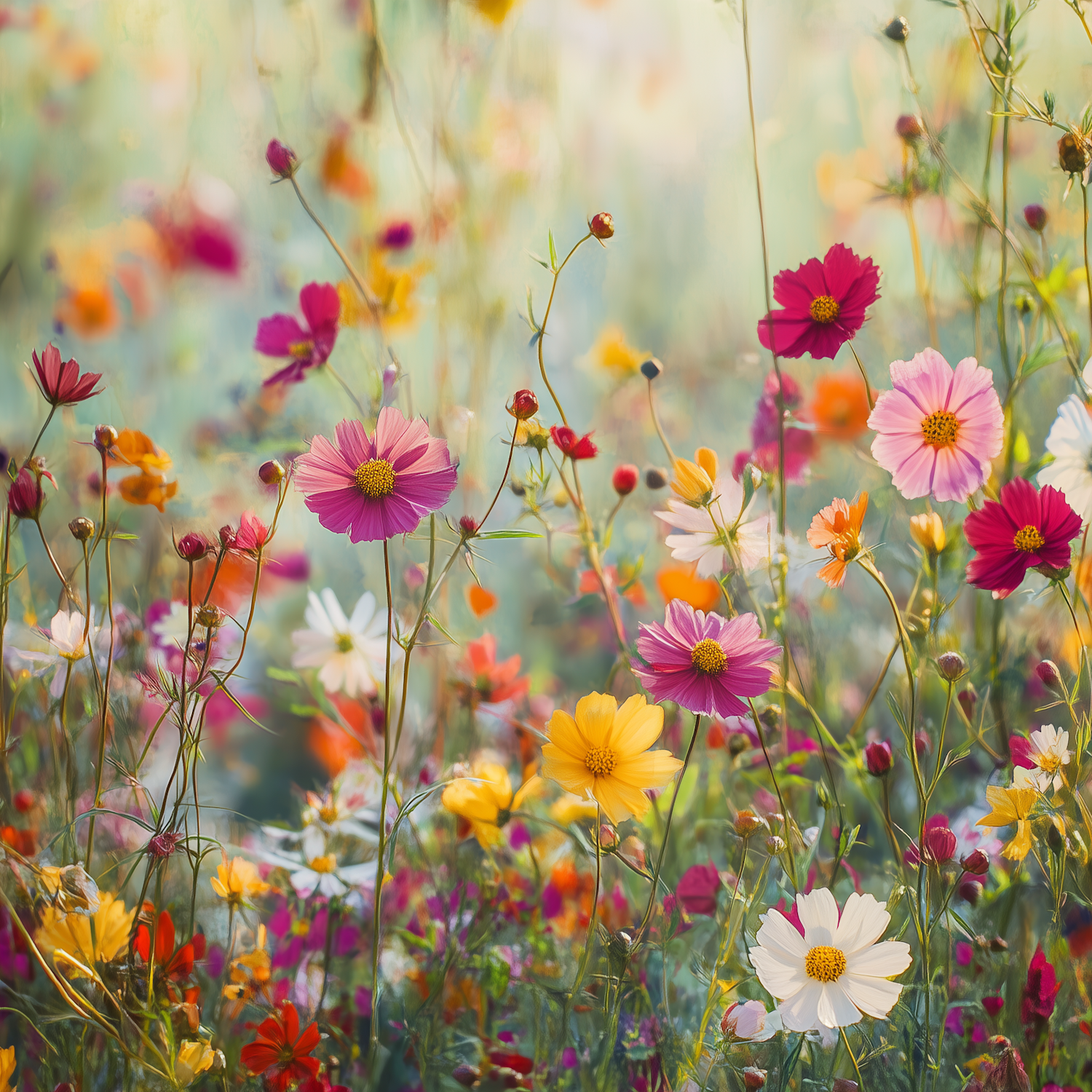 A vibrant field of colorful wildflowers in full bloom, with pink, yellow, and white blossoms creating a dreamy, ethereal scene.