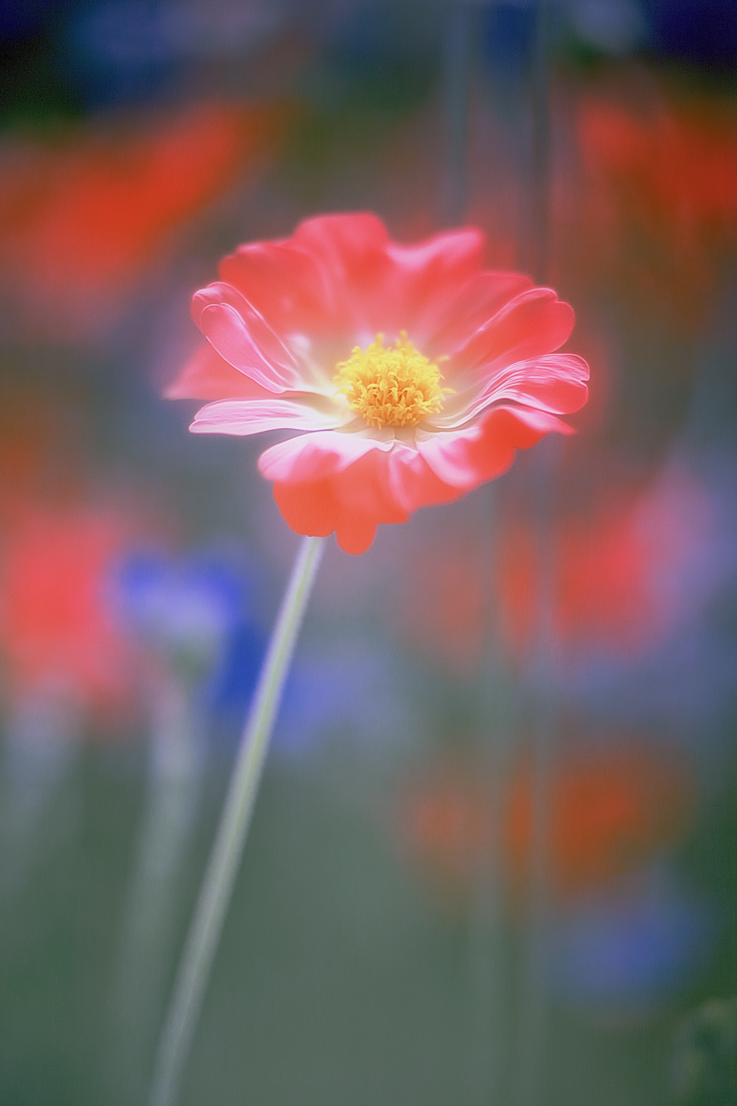 Vibrant pink flower with yellow center against a dreamy, blurred background of greens and soft colors.