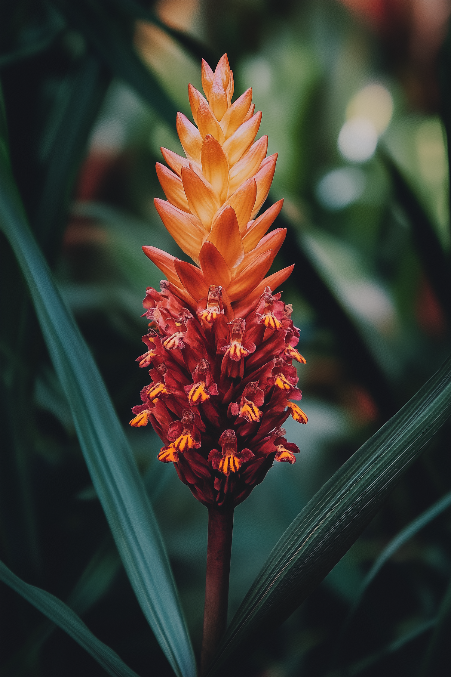 Vibrant tropical flower with orange and red petals against a lush green background, showcasing nature's vivid colors and textures.