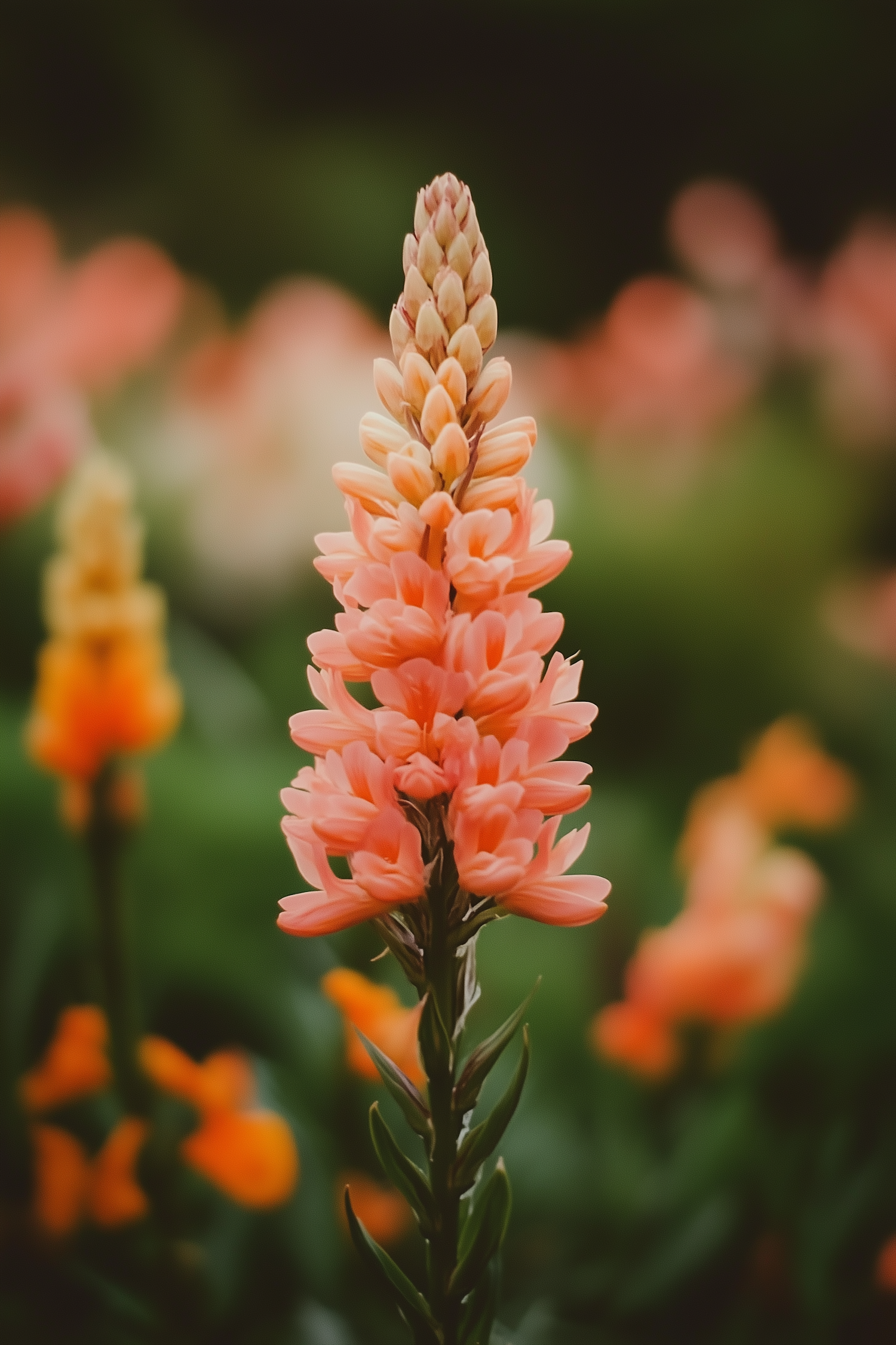 Vibrant peach and cream flower with lush petals, set against a blurred background of similar blooms in a serene garden setting.