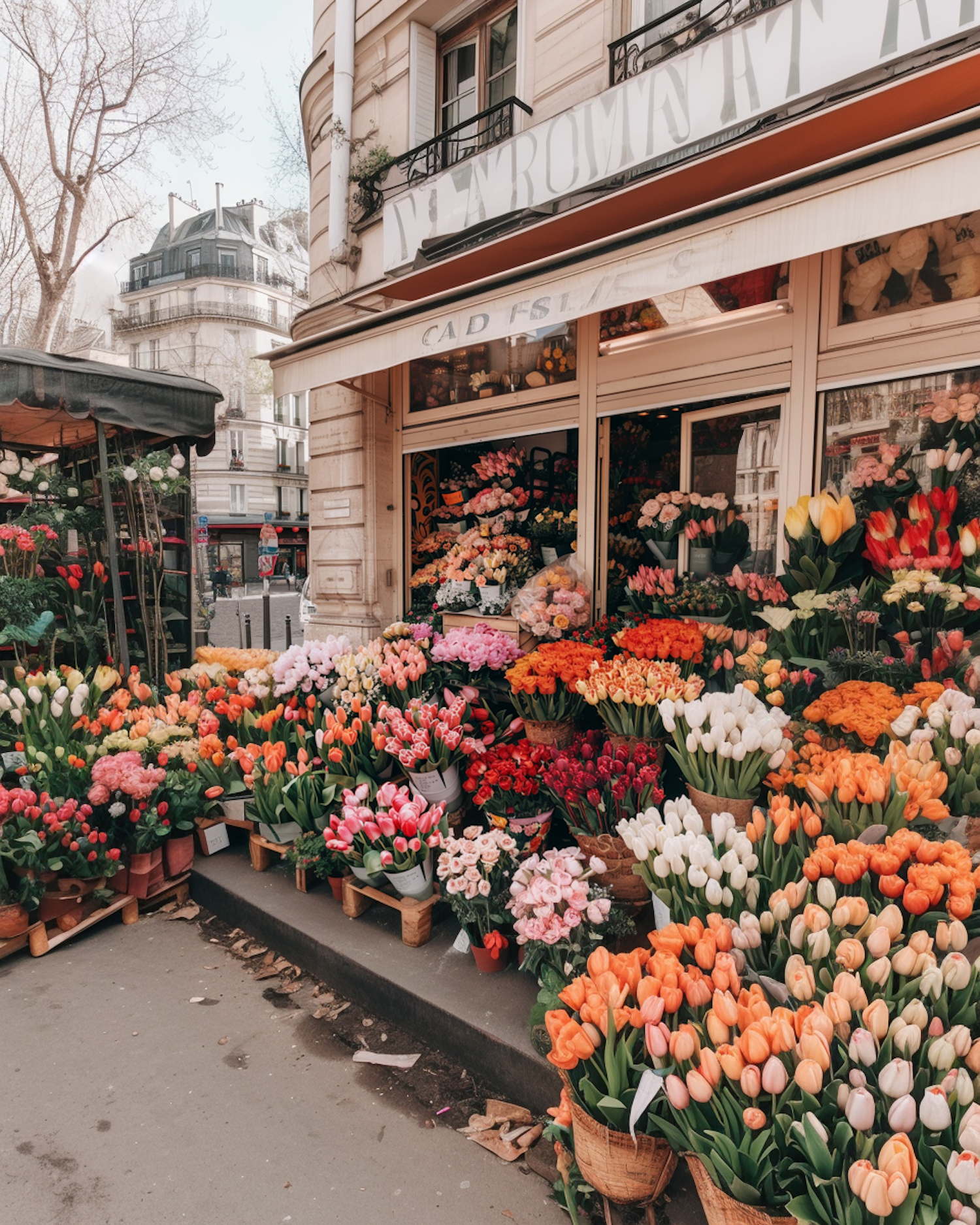 Charming Parisian flower shop with vibrant tulips and roses on display, set against classic architecture and a quiet street corner.