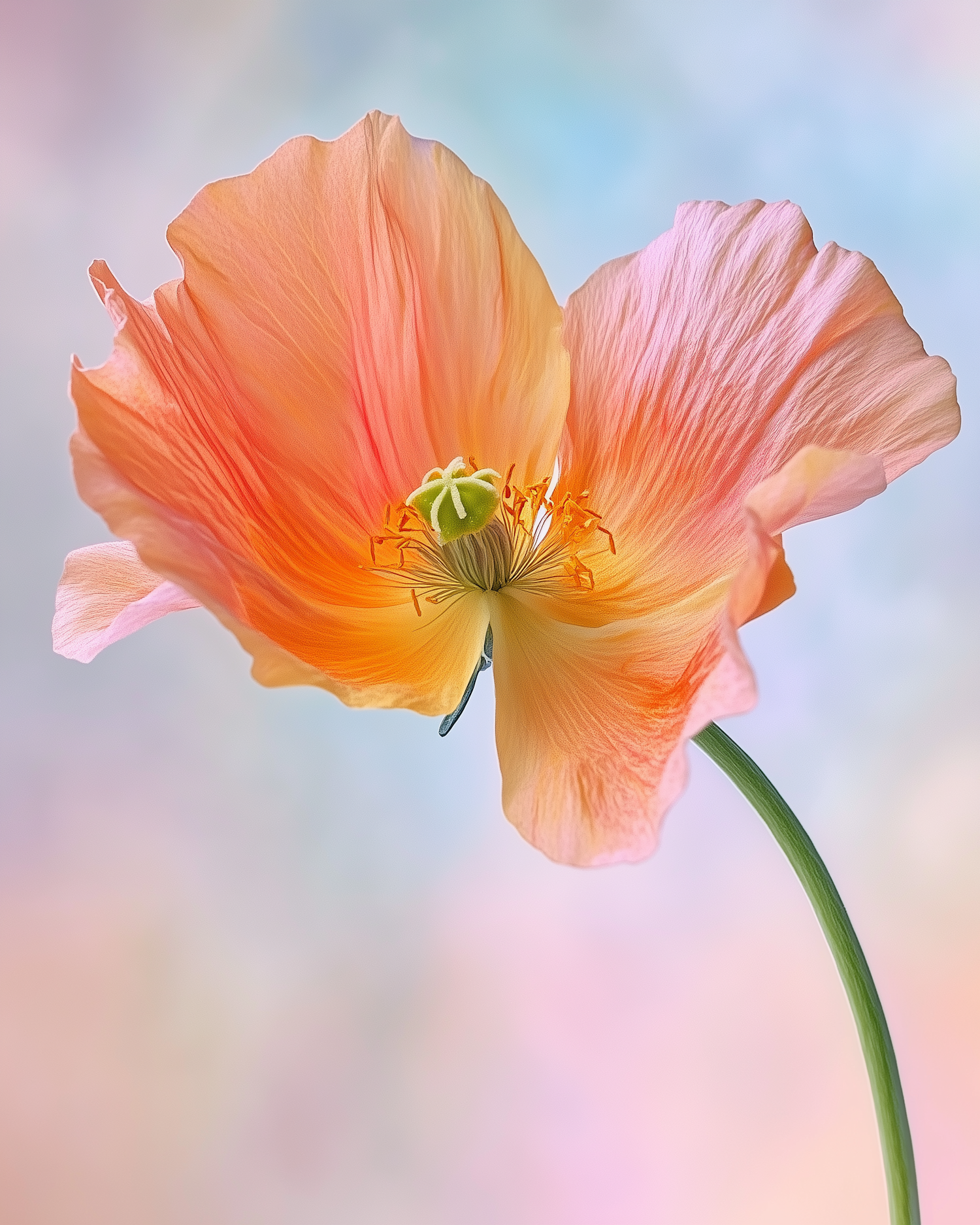 Close-up of a vibrant poppy flower with peach and pink petals against a soft pastel background.