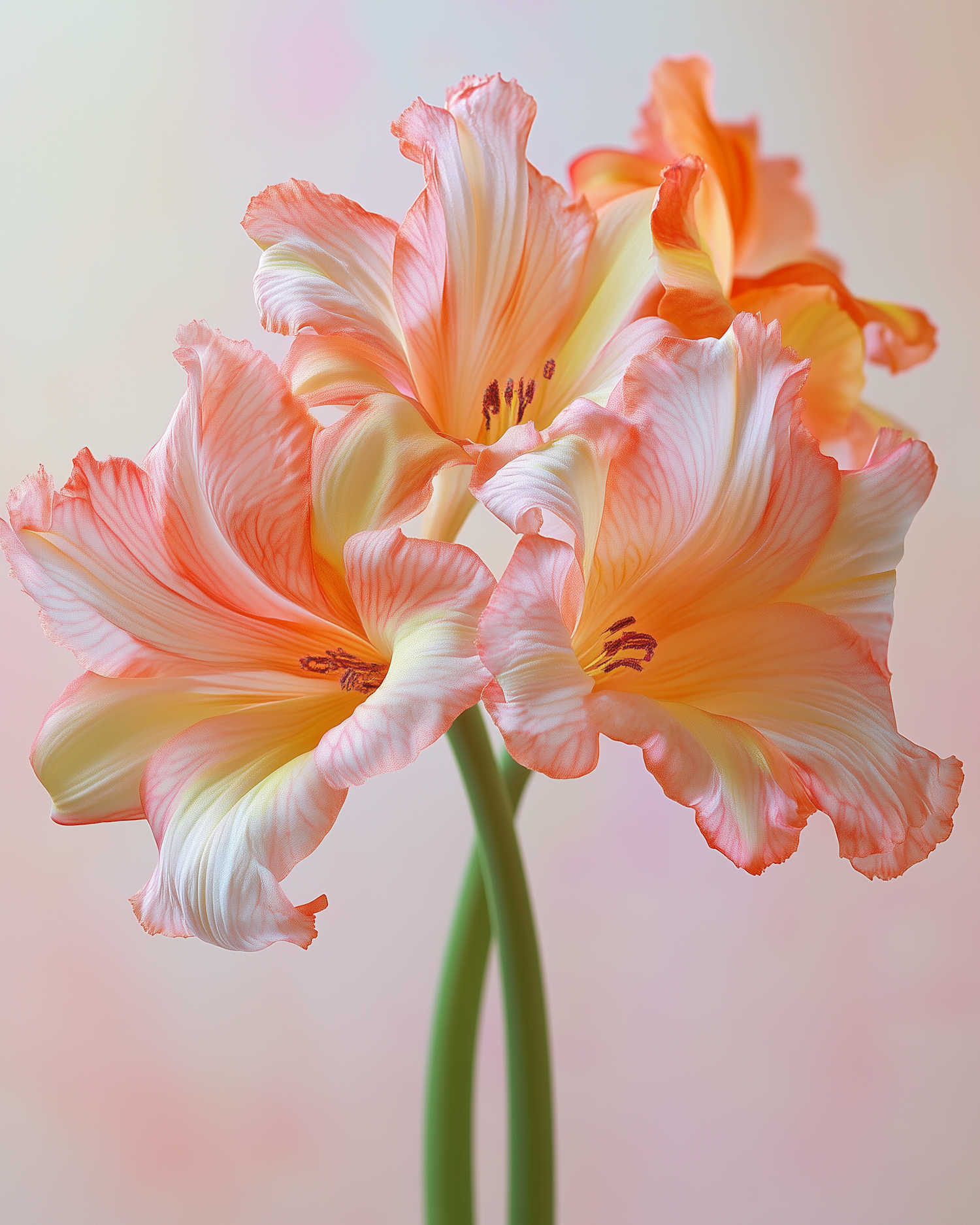 Vibrant amaryllis flowers with soft orange and yellow petals, set against a pastel background, showcasing their delicate beauty.