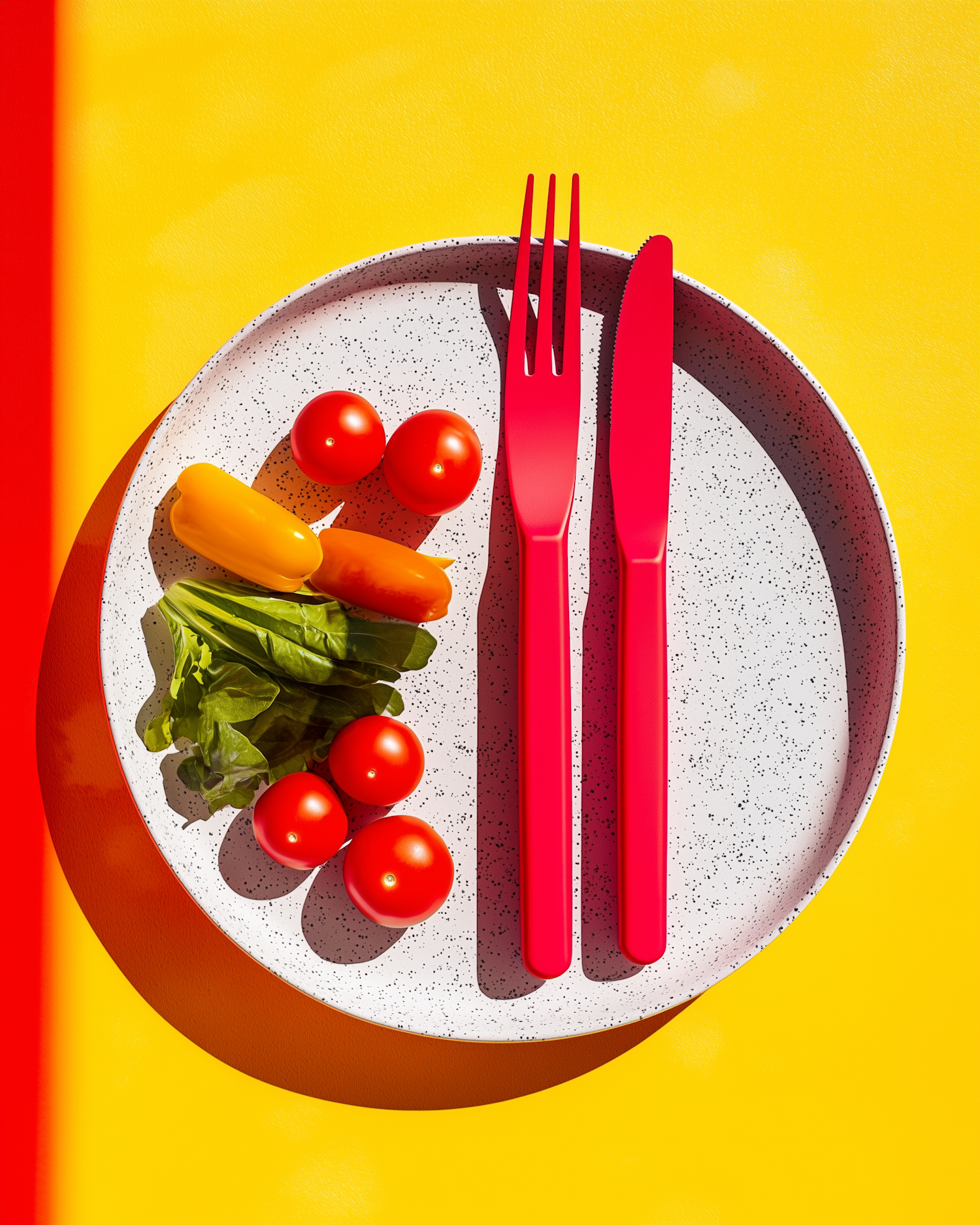 Colorful plate with fresh veggies and red cutlery on a bright yellow background. Vibrant and modern food presentation.