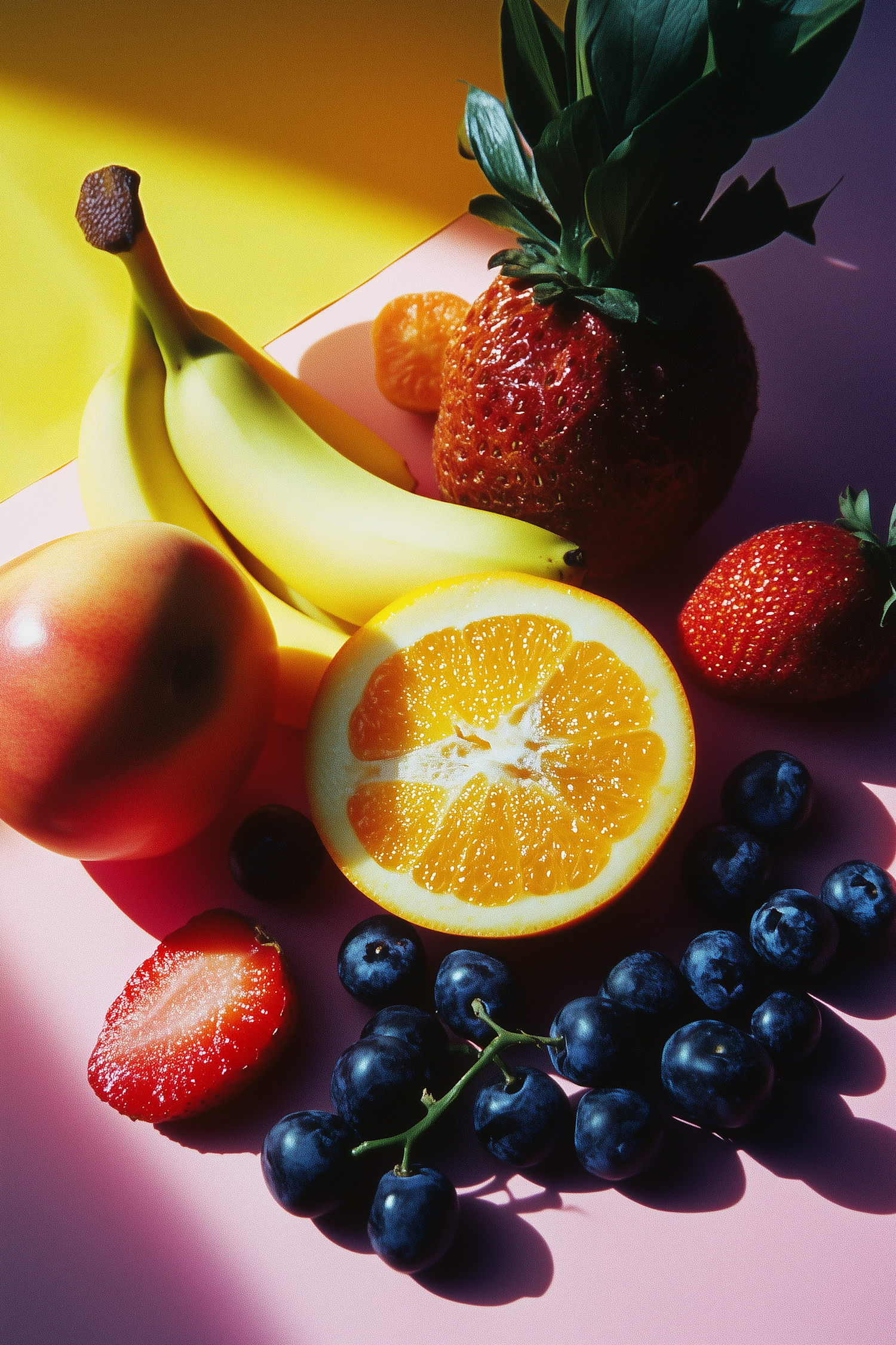 Colorful assortment of fruits including bananas, strawberries, orange, blueberries, and peach on a vibrant yellow and pink background.