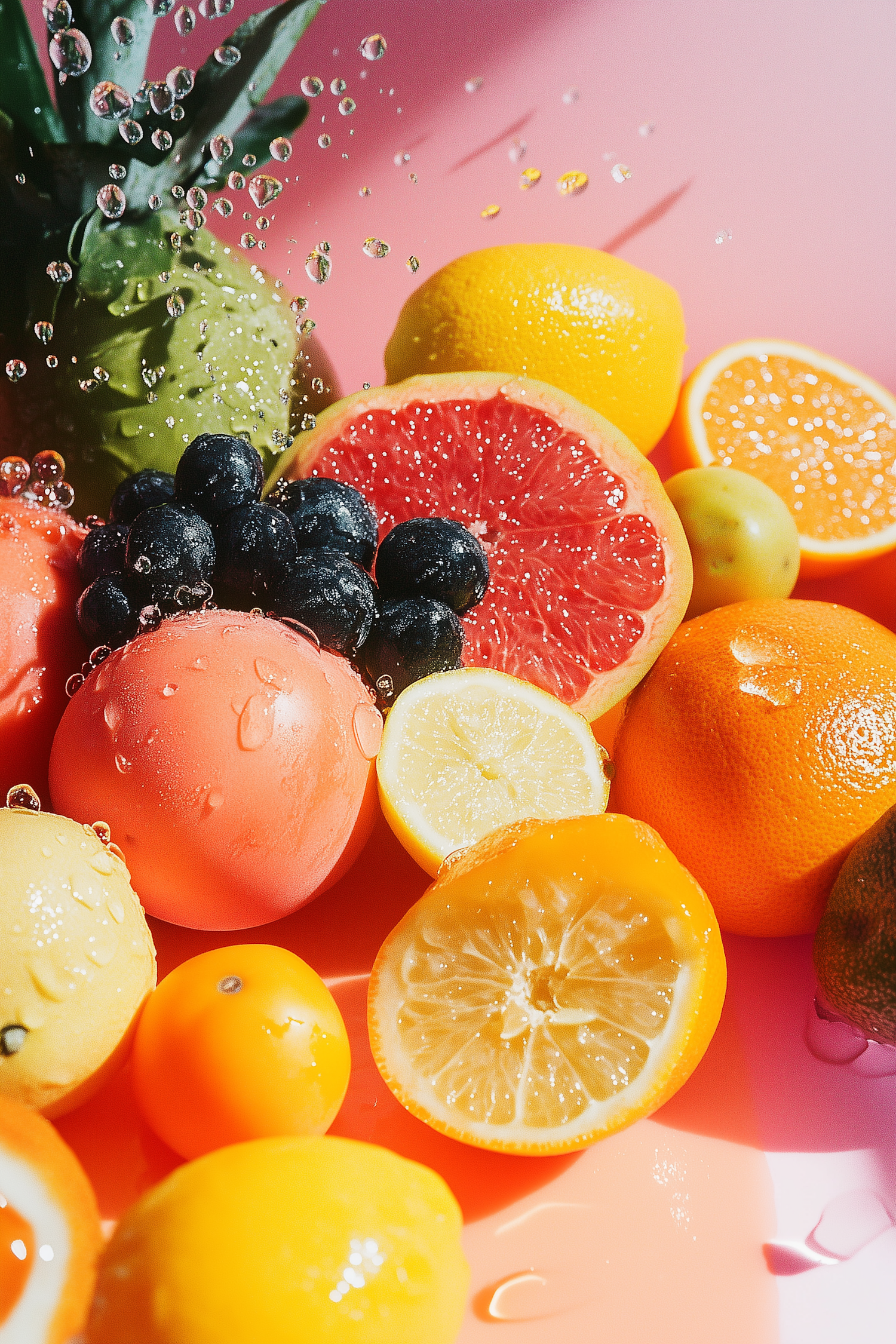 Vibrant fruits with water droplets on a pink background, featuring grapefruit, lemons, oranges, blueberries, and pineapple.