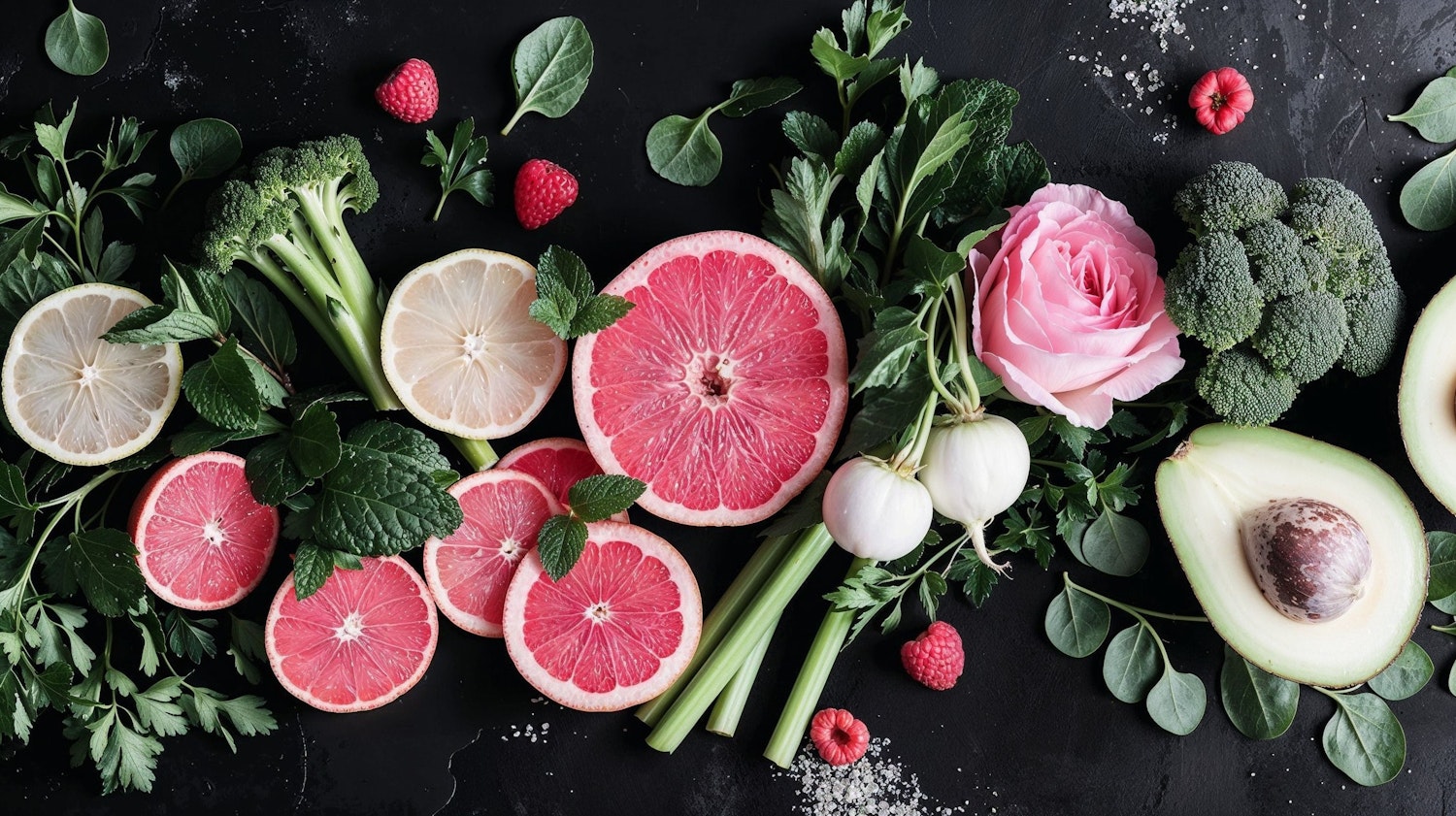 A vibrant display of sliced grapefruits, lemons, avocados, broccoli, raspberries, and a pink rose on a dark background.