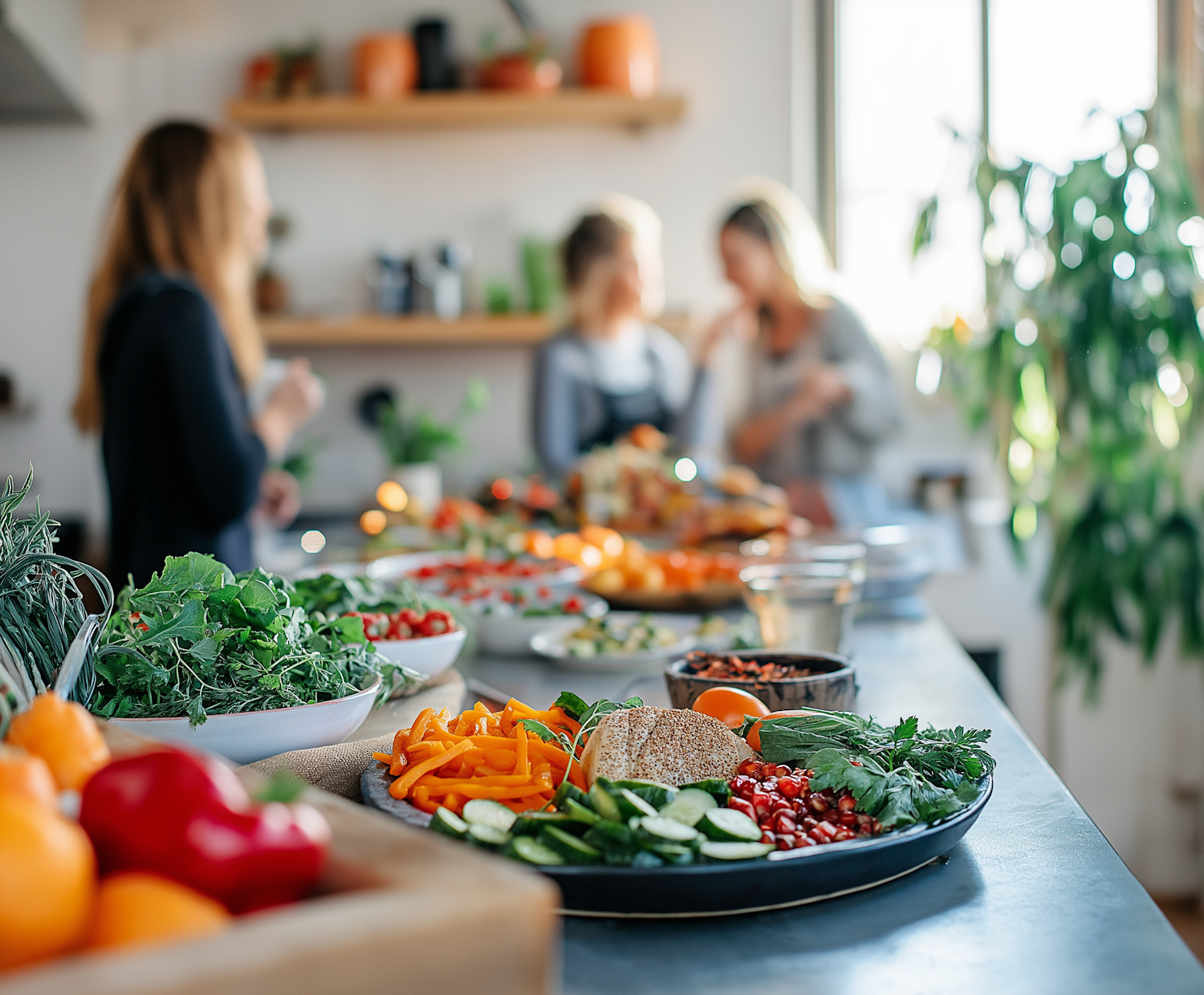 Bright kitchen with fresh vegetables, fruits, and herbs on a countertop, with blurred women chatting in the background.