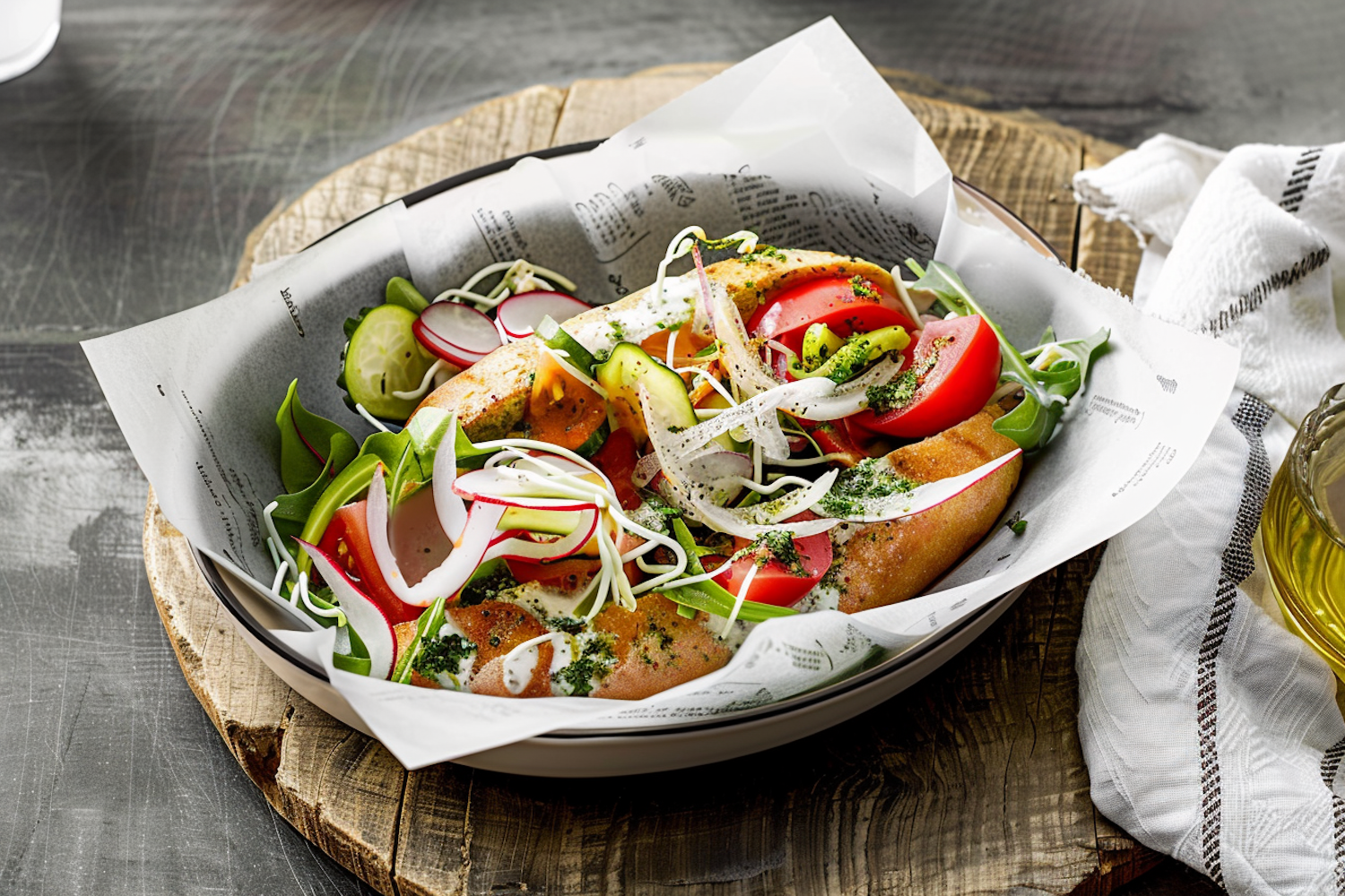 Fresh sandwich with tomatoes, radishes, cucumbers, and herb sauce on a rustic wooden board, served with olive oil.