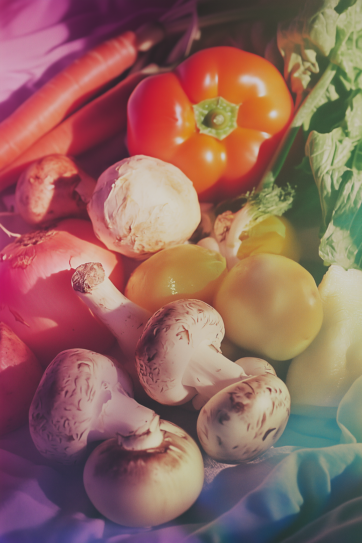 A colorful mix of fresh vegetables, including carrots, mushrooms, bell pepper, and leafy greens, illuminated with a dreamy gradient light.