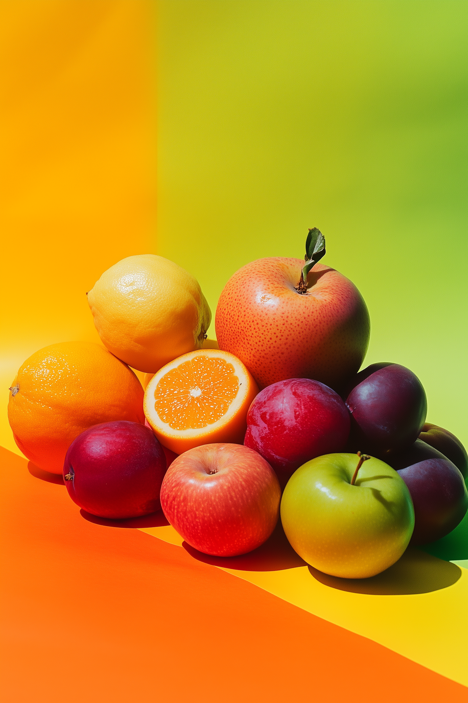 Colorful fruit arrangement with lemon, orange, grapefruit, apples, and plums on a vibrant yellow-green background.