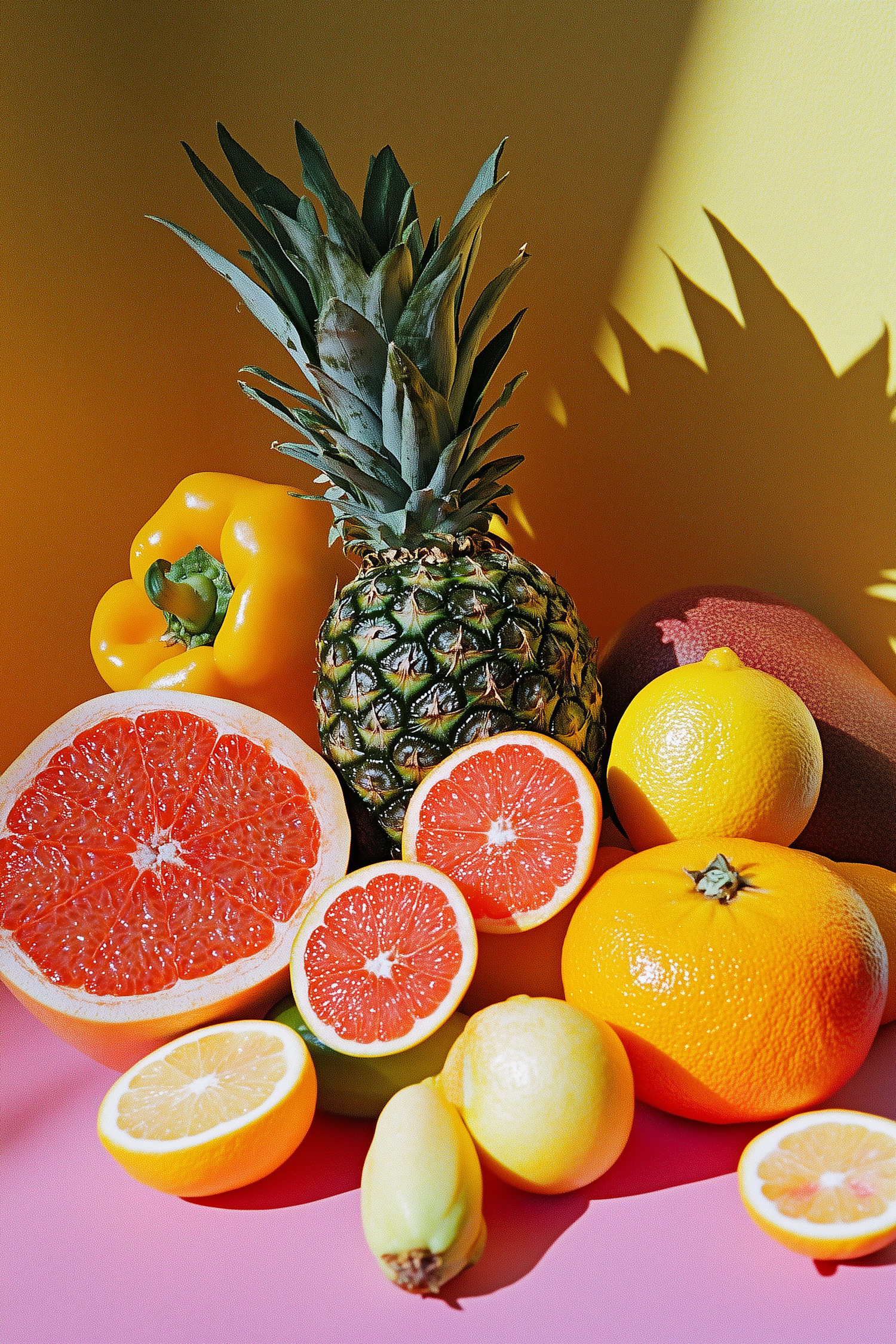 Vibrant fruit arrangement with pineapple, citrus, and bell pepper on a bright yellow background, showcasing vivid colors and textures.