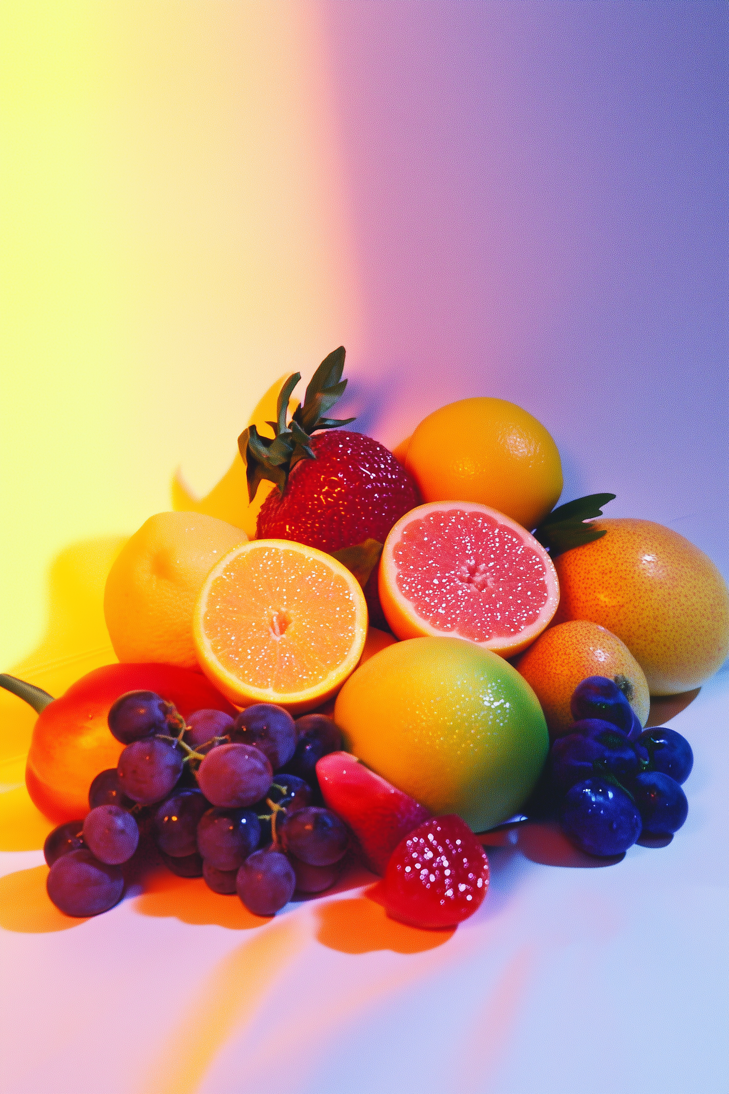 Colorful fruit arrangement with strawberry, grapefruit, lemon, and grapes against a gradient background.