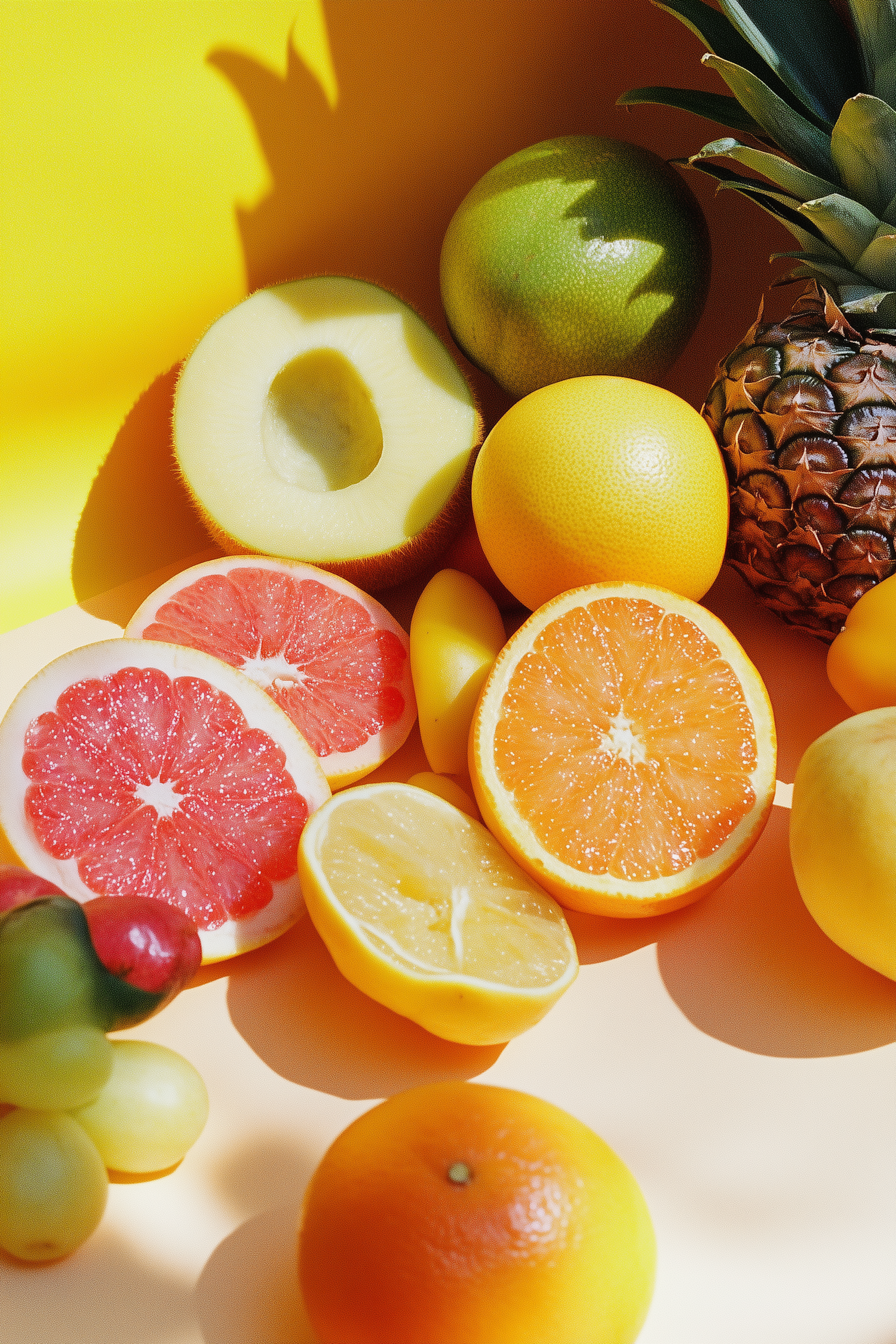 A colorful array of fresh fruits including grapefruit, orange, lemon, and pineapple on a bright yellow background.