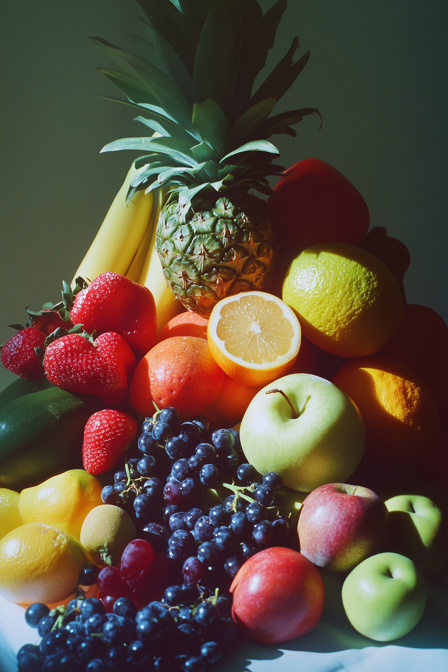 A colorful arrangement of fruits including pineapple, bananas, strawberries, oranges, grapes, and apples, showcasing vibrant natural hues.
