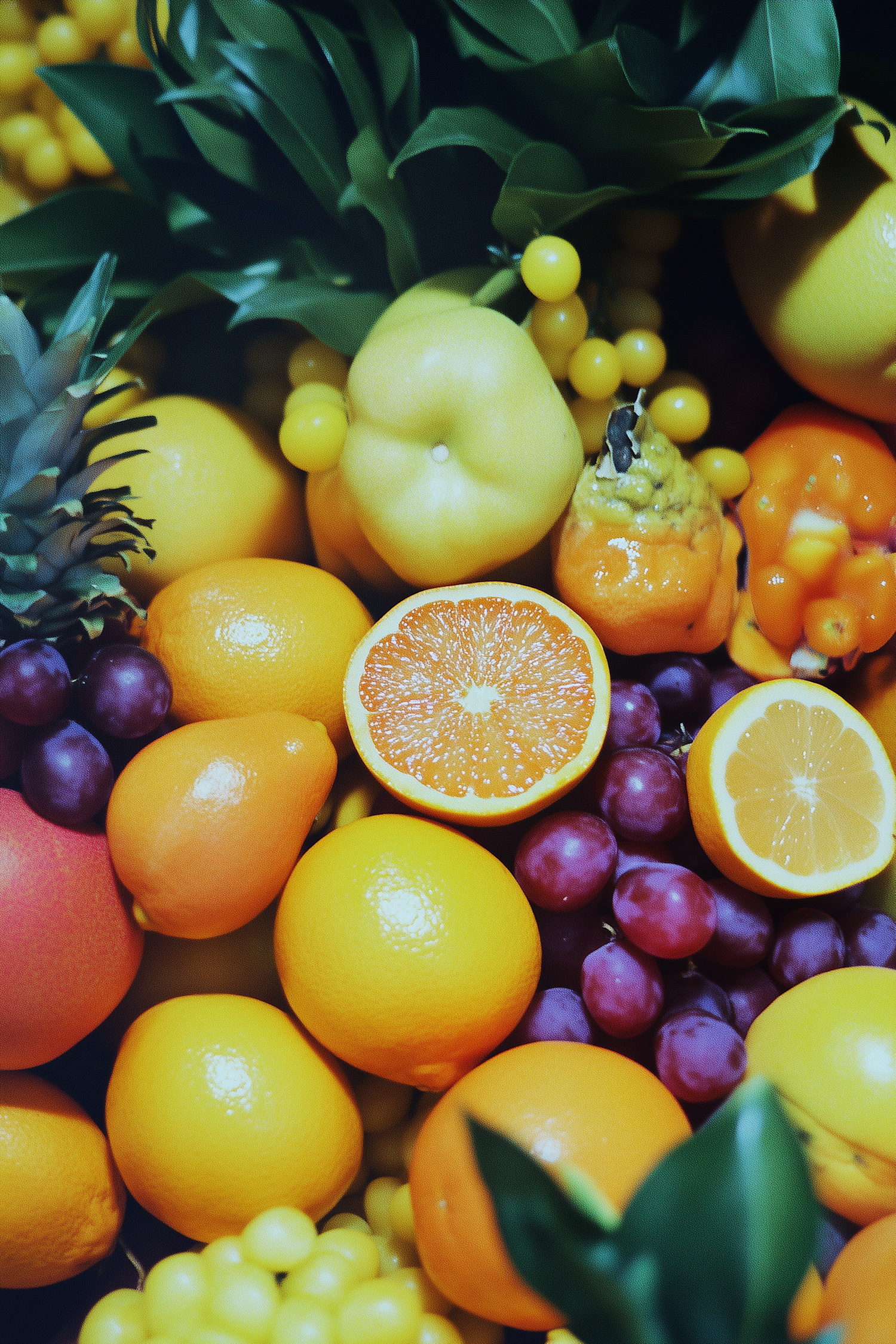 A colorful assortment of fresh fruits including oranges, lemons, and grapes, showcasing vibrant colors and textures.