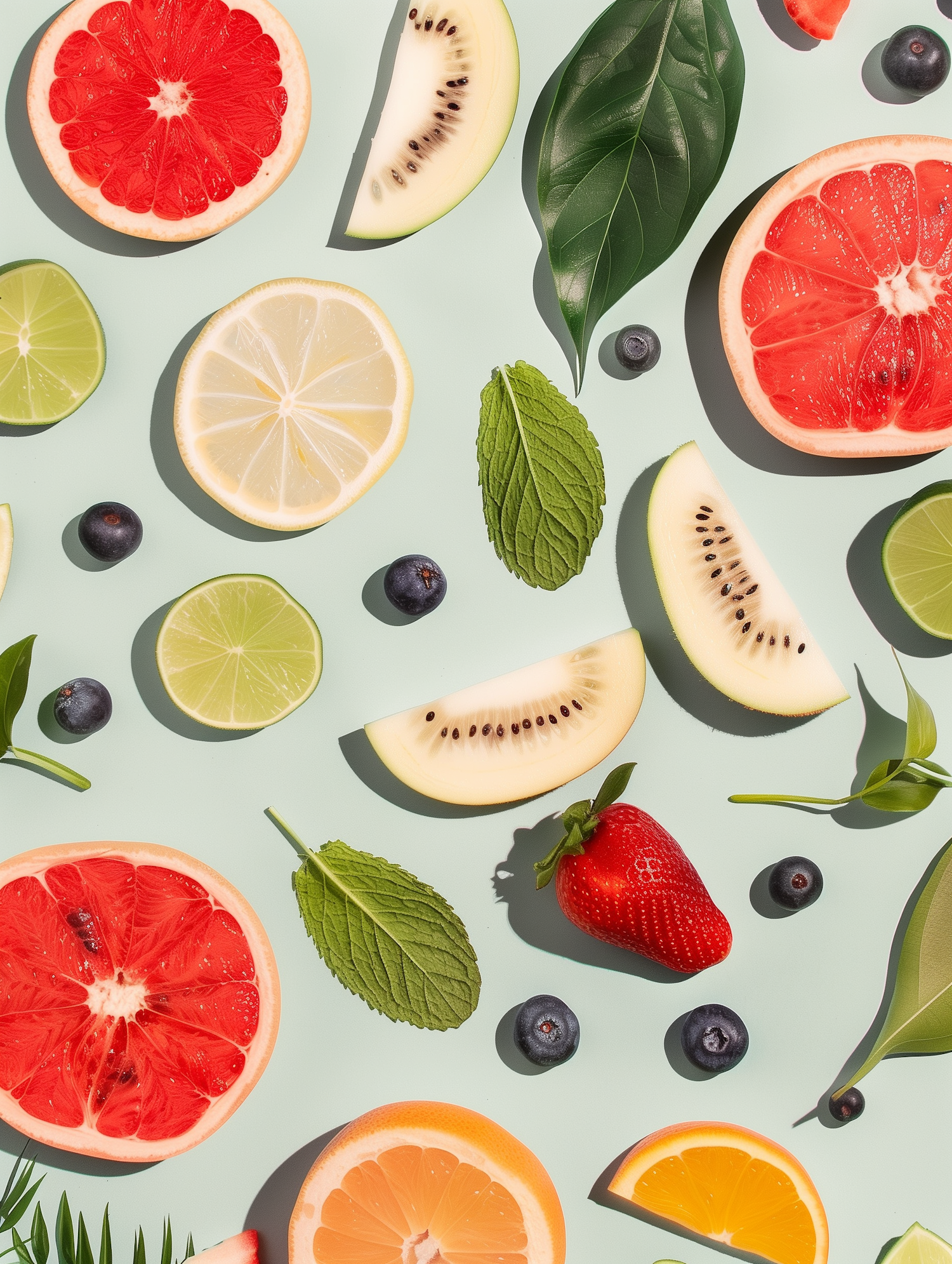 Bright flat lay of citrus fruits, white kiwi, berries, and mint leaves on a pastel green background. Perfect for fresh, vibrant vibes.