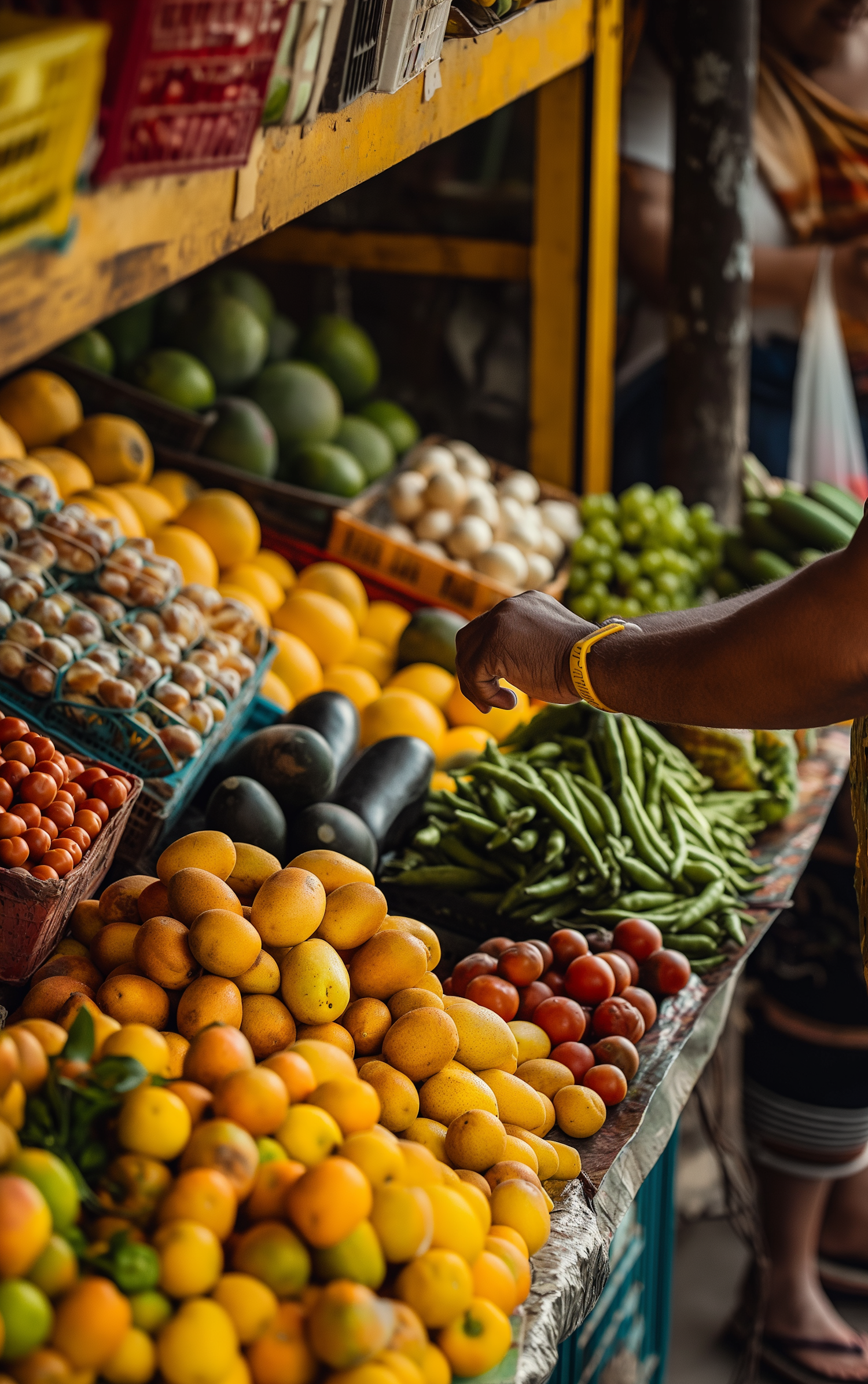 Colorful market stall with fresh mangoes, tomatoes, and green beans. A shopper's hand reaches for produce, adding life to the scene.