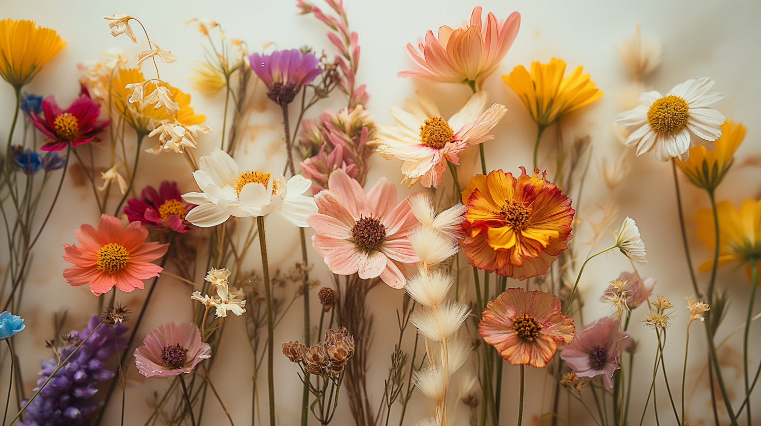 A vibrant array of colorful wildflowers against a soft background, showcasing pink, yellow, orange, and purple hues.