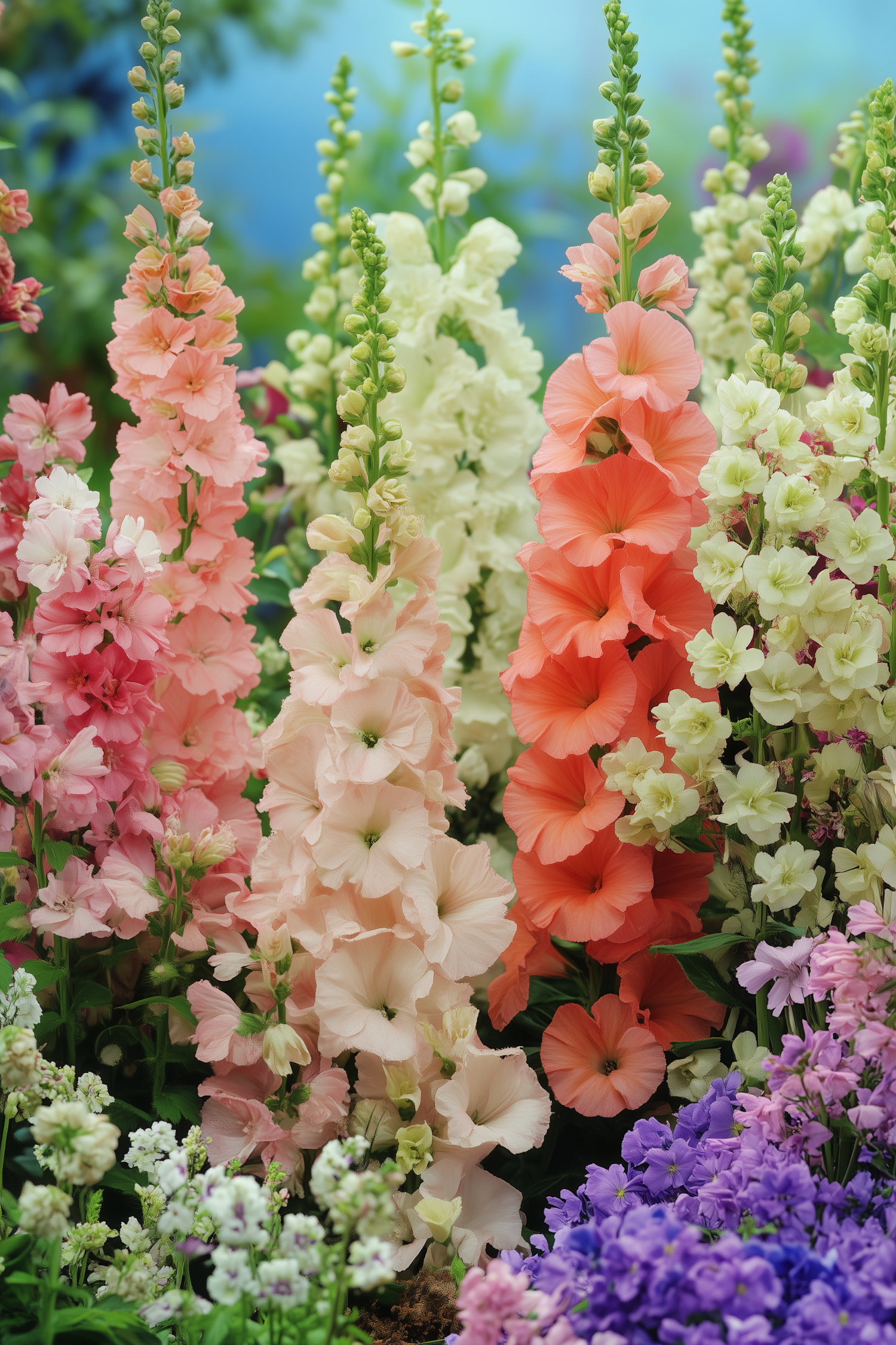 A vibrant garden with tall, colorful flowers in pink, peach, white, and orange, surrounded by lush greenery and smaller blooms.