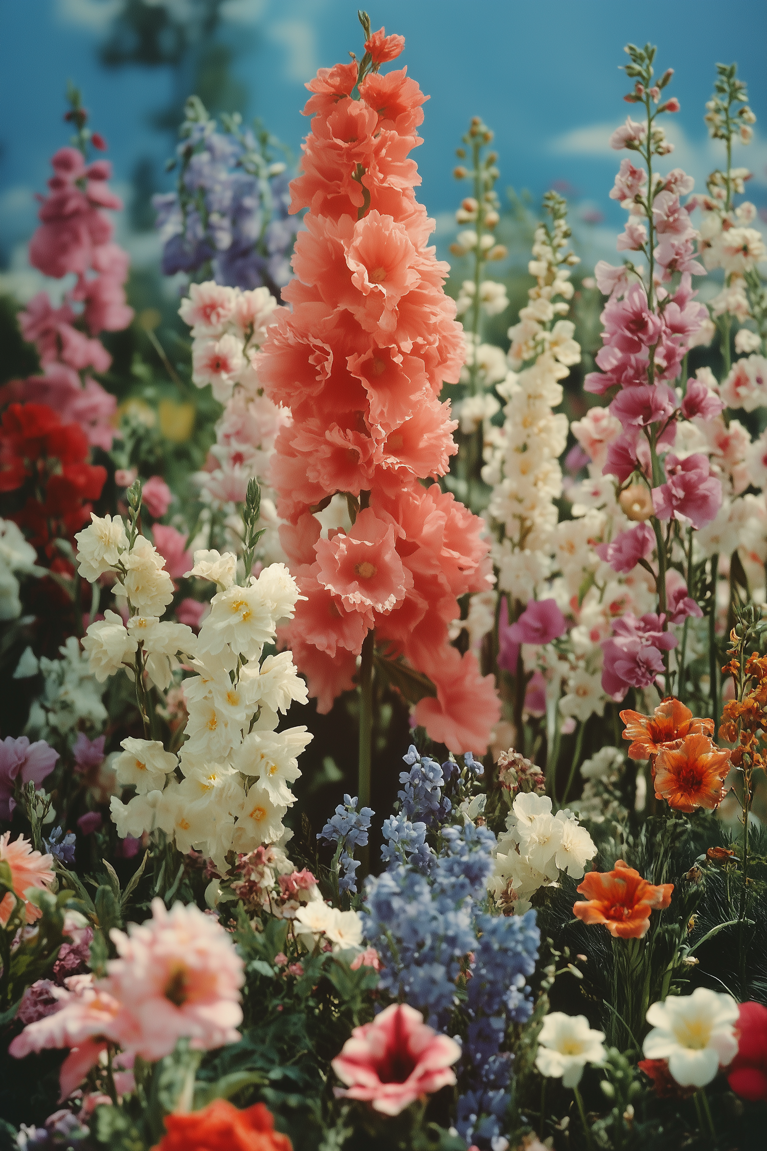 Vibrant garden with coral pink, white, purple, and red flowers against a clear blue sky, creating a lush and colorful scene.
