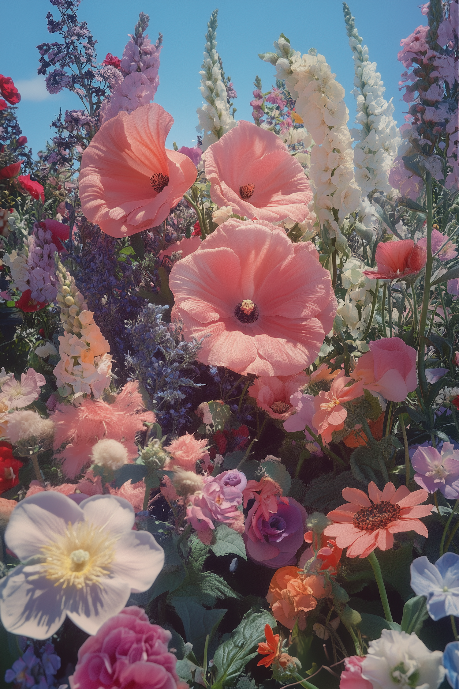 A vibrant garden with pink poppies, white snapdragons, and colorful blooms under a clear blue sky.