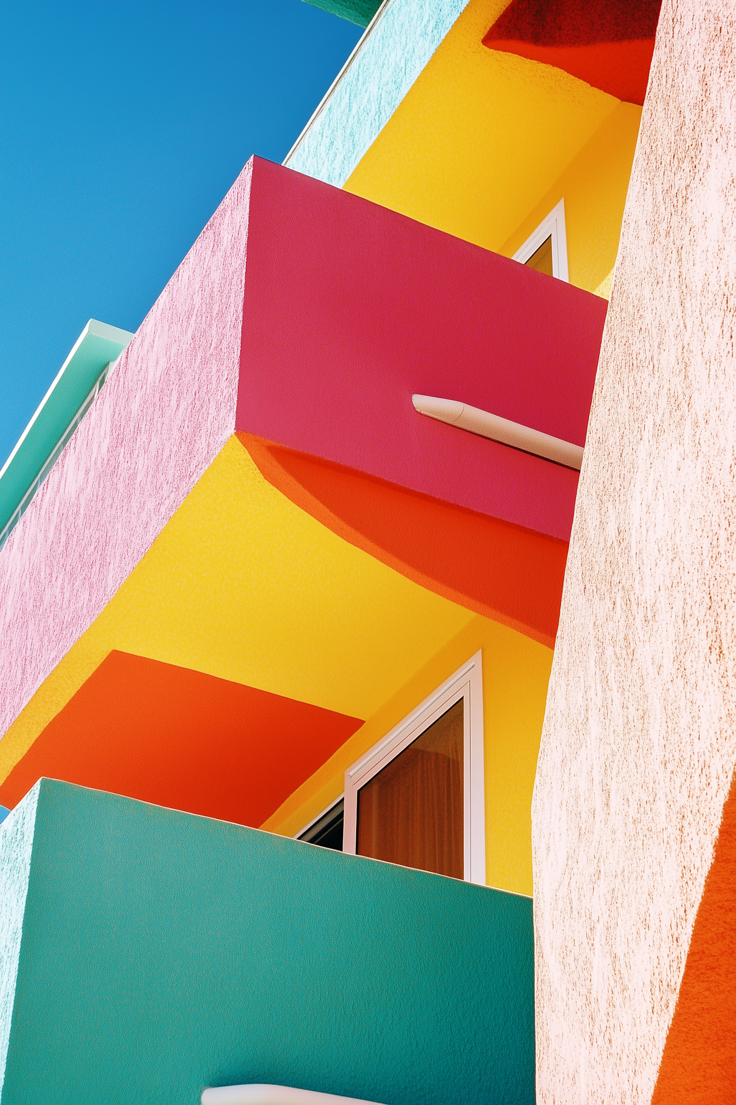 Colorful geometric building with vibrant pink, yellow, orange, and teal balconies against a clear blue sky.