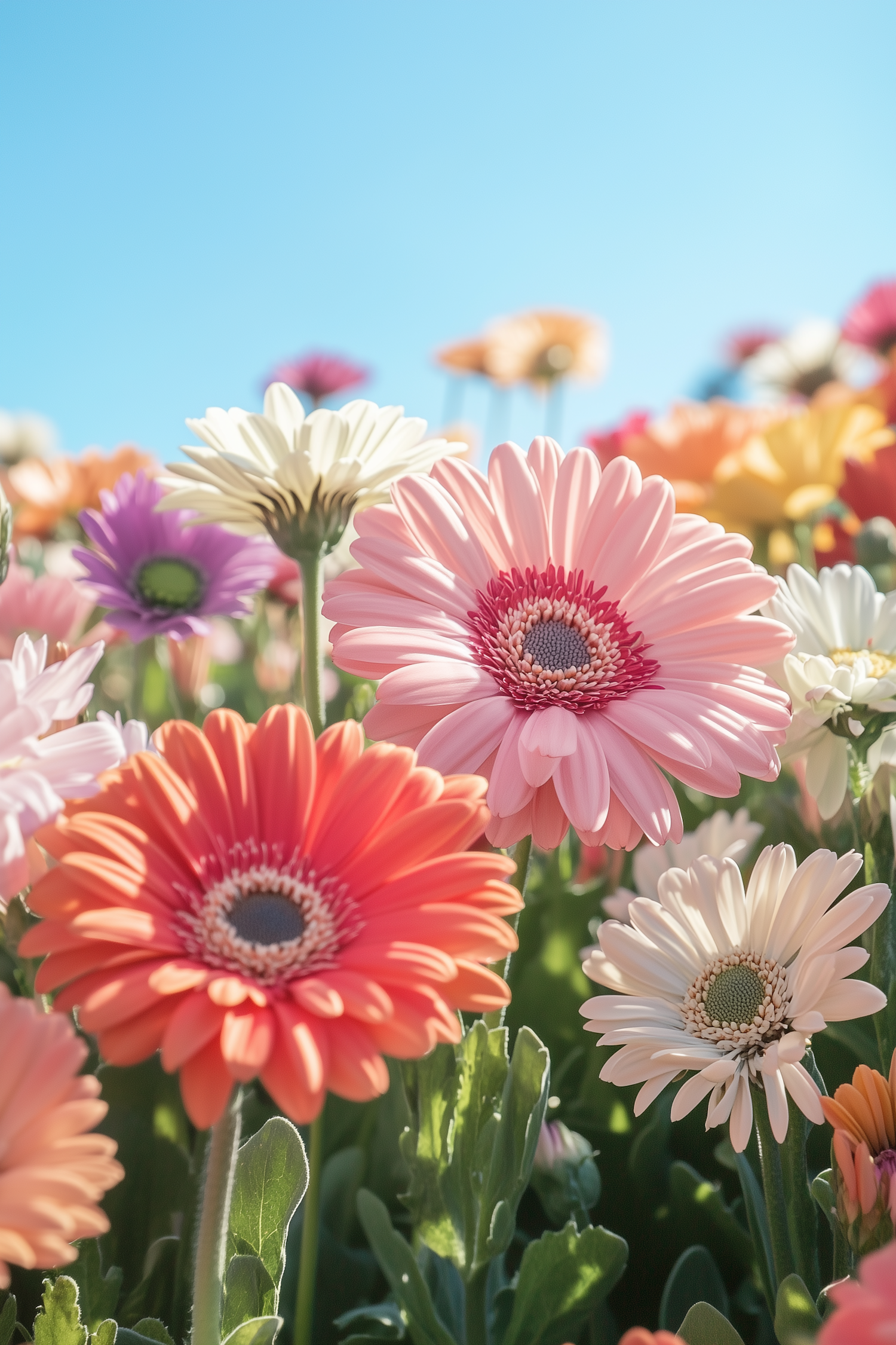 Vibrant gerbera daisies in full bloom under a clear blue sky, showcasing pink, orange, white, and purple hues.