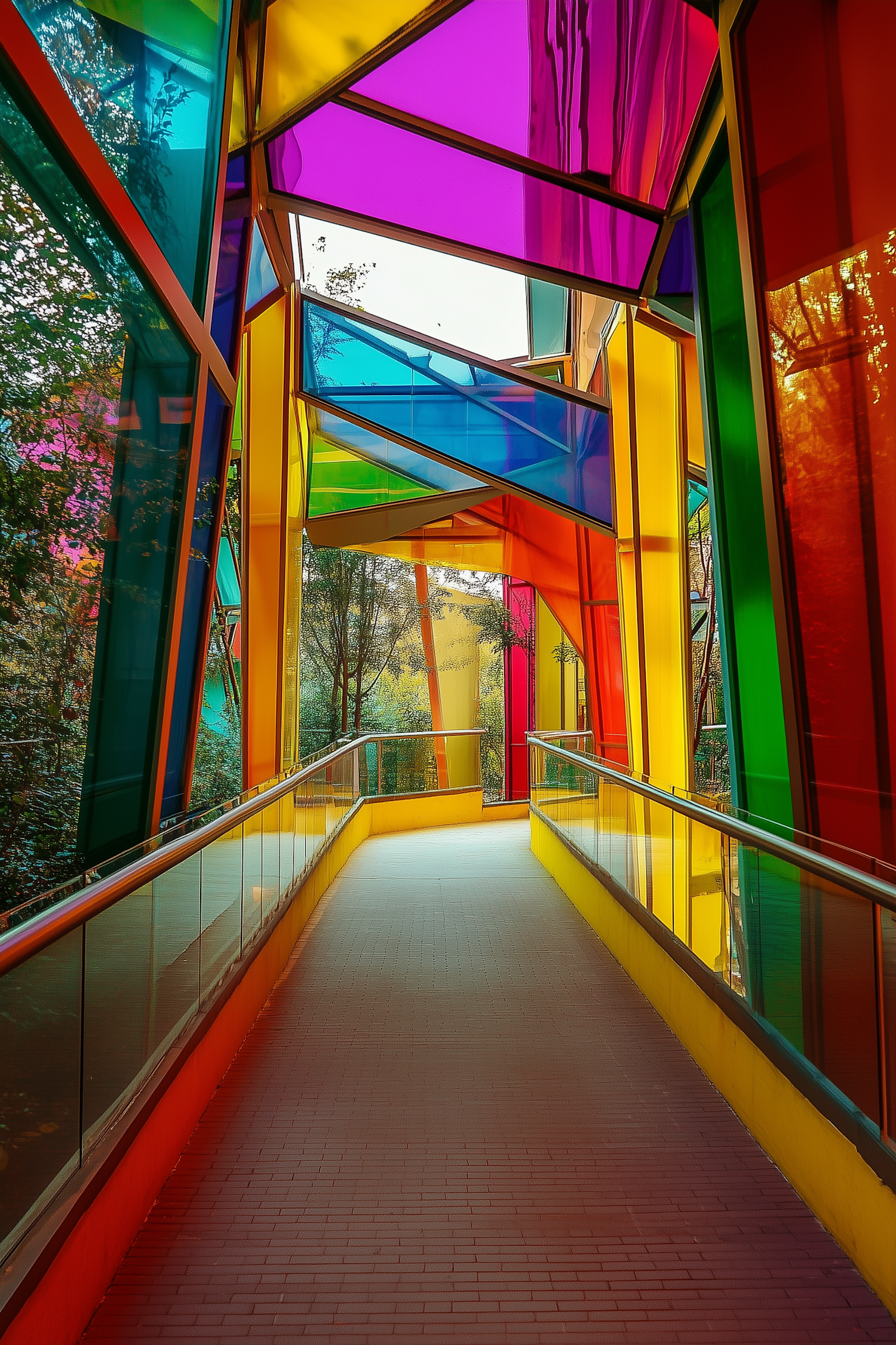 Colorful corridor with geometric translucent panels casting vibrant shadows and reflections, surrounded by trees.