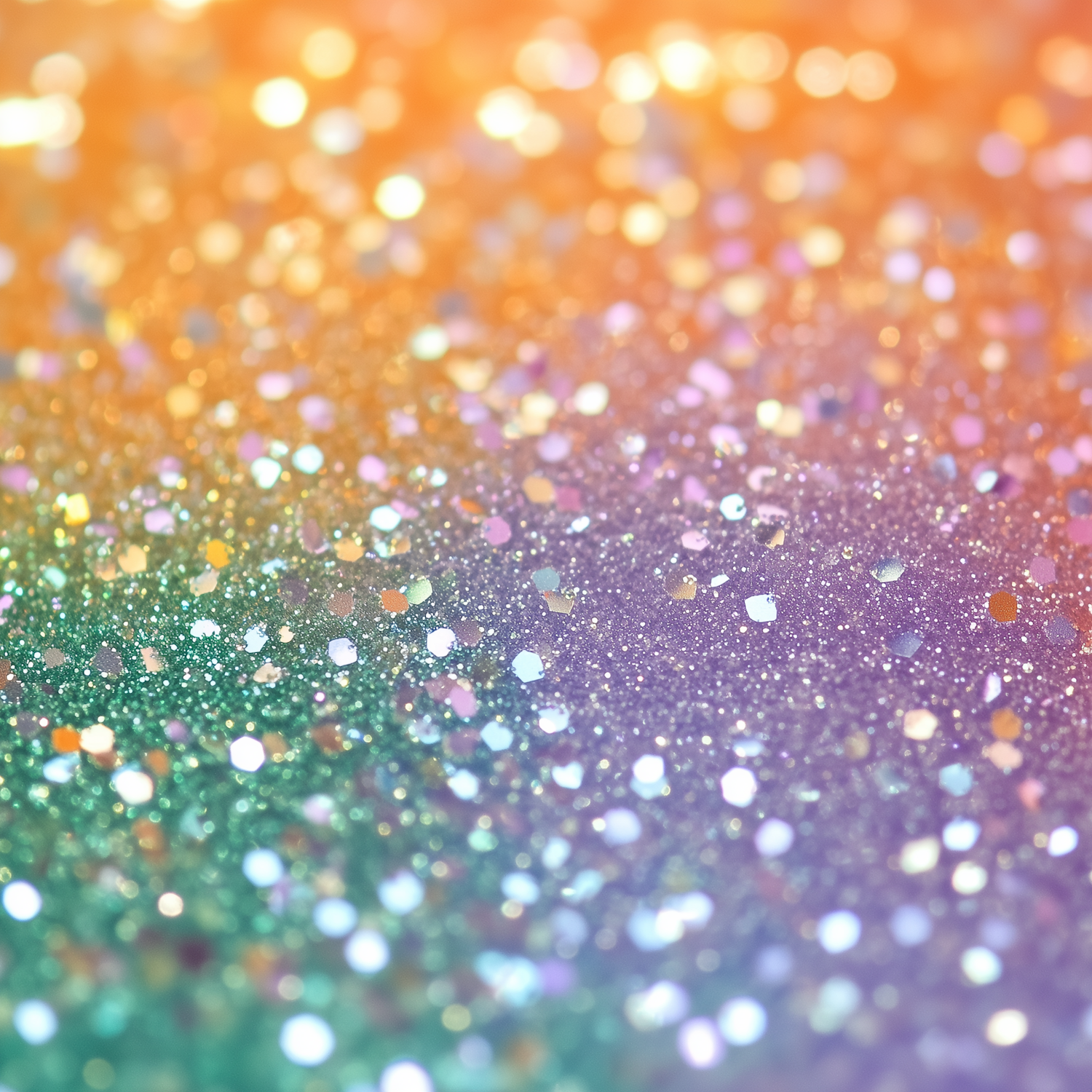 Close-up of colorful glitter with a gradient from orange to purple, creating a sparkling, festive, and dreamy bokeh effect.