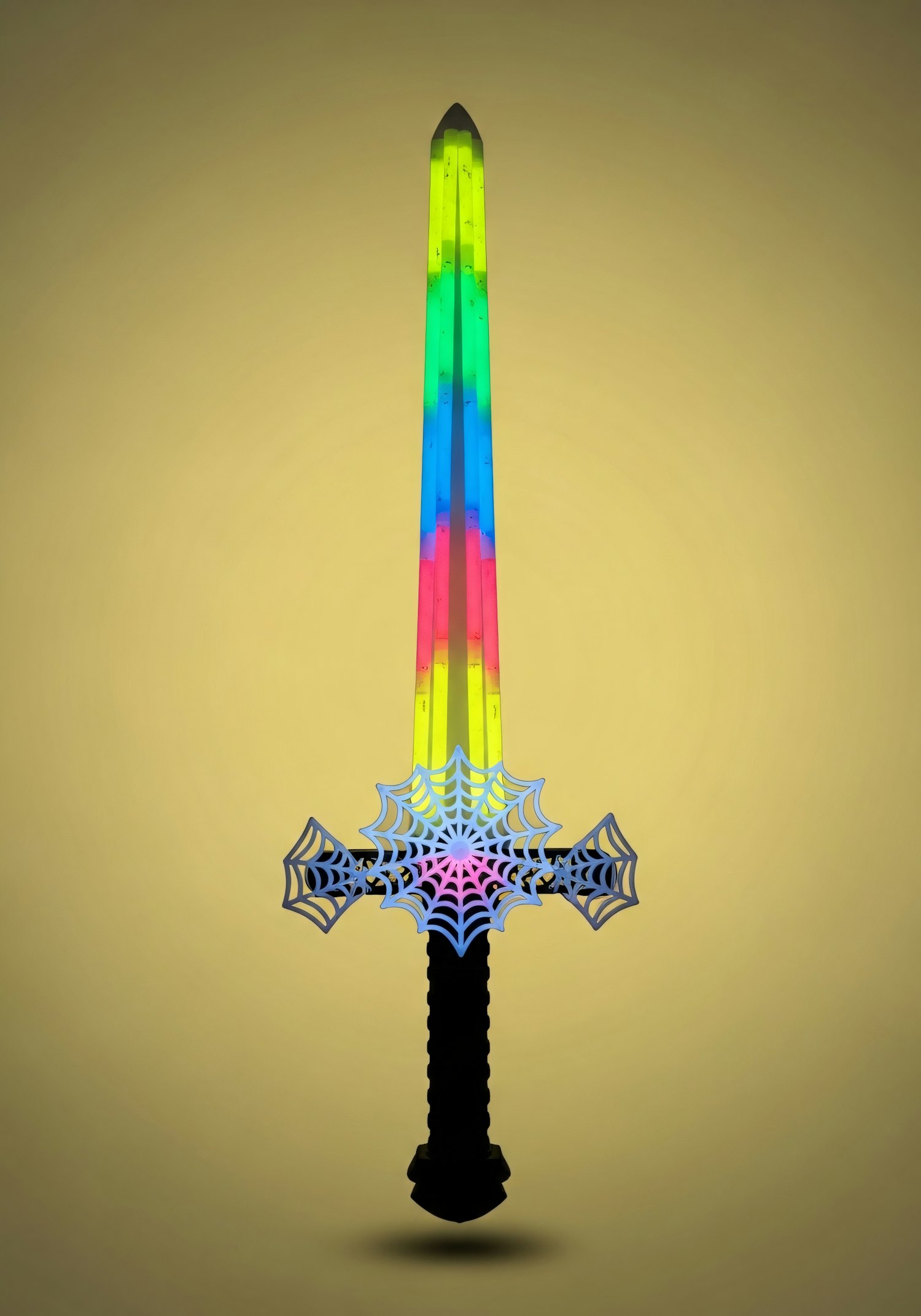 A glowing multicolored sword with a web-like hilt design, set against a warm yellow gradient background.