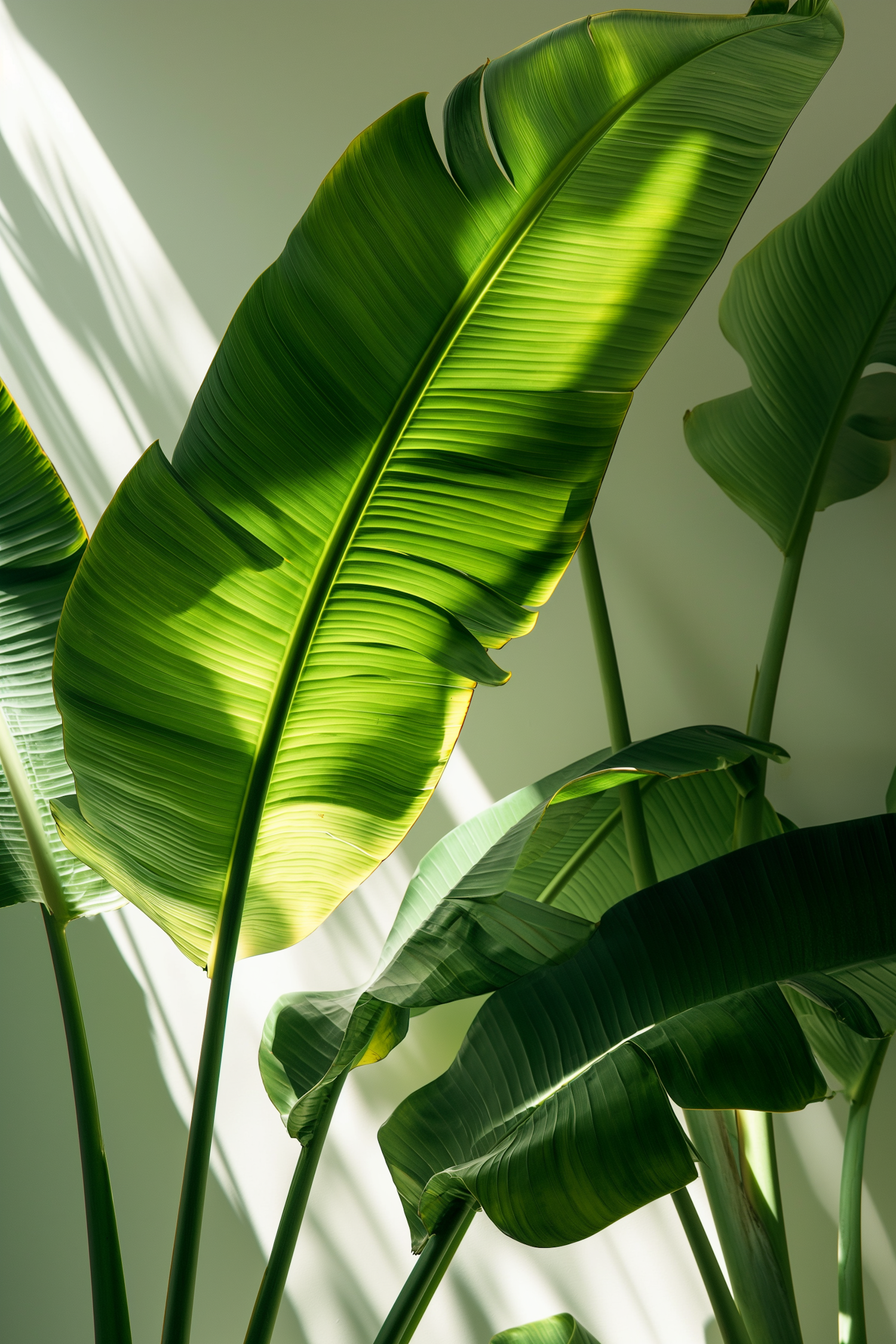 Vibrant green banana leaves with sunlight and shadows, creating a tropical and serene atmosphere.