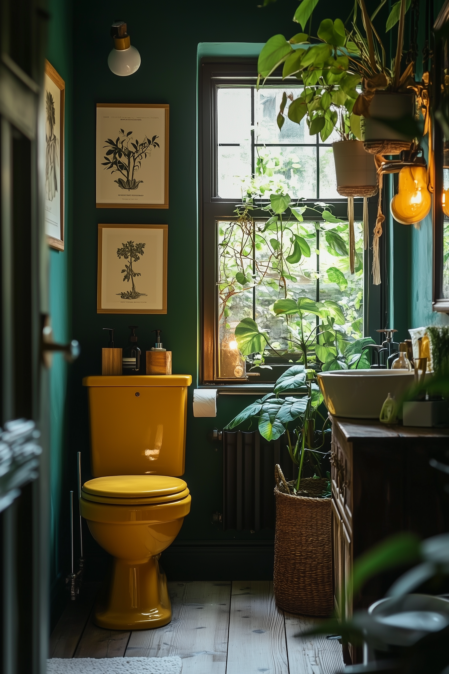Stylish bathroom with a bold yellow toilet, green walls, lush plants, and rustic wooden accents for a cozy, natural vibe.