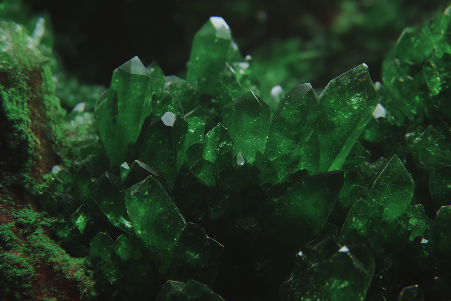 Close-up of green crystal clusters with sharp facets, showcasing their detailed structure against a blurred natural-themed background.