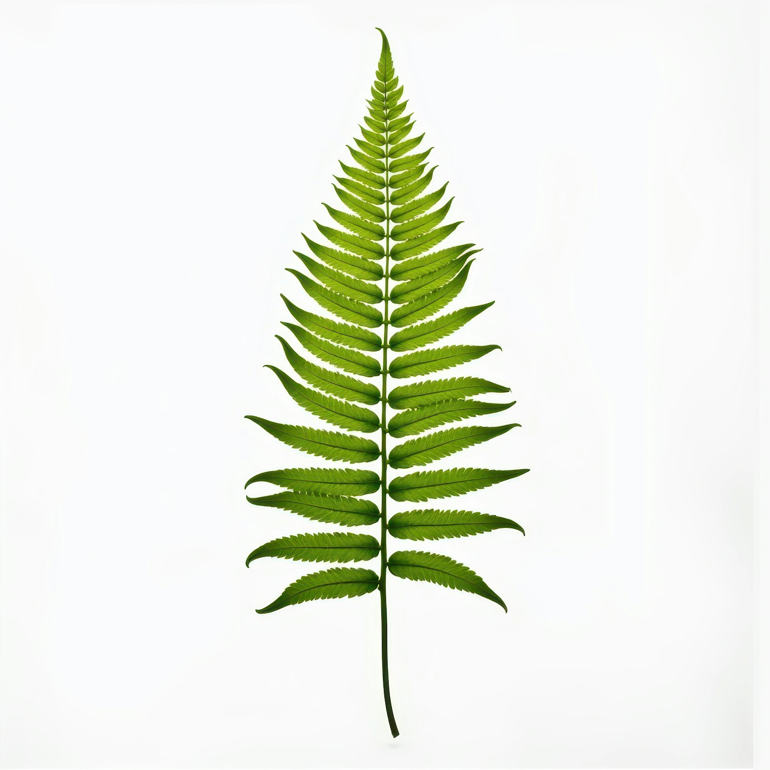 Vibrant green fern leaf on a white background, showcasing its symmetrical and intricate pattern.