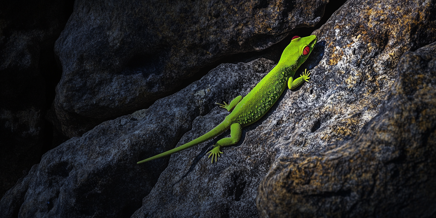 Vibrant green gecko with red eyes on a rugged rock surface, showcasing vivid colors and textures in a natural setting.