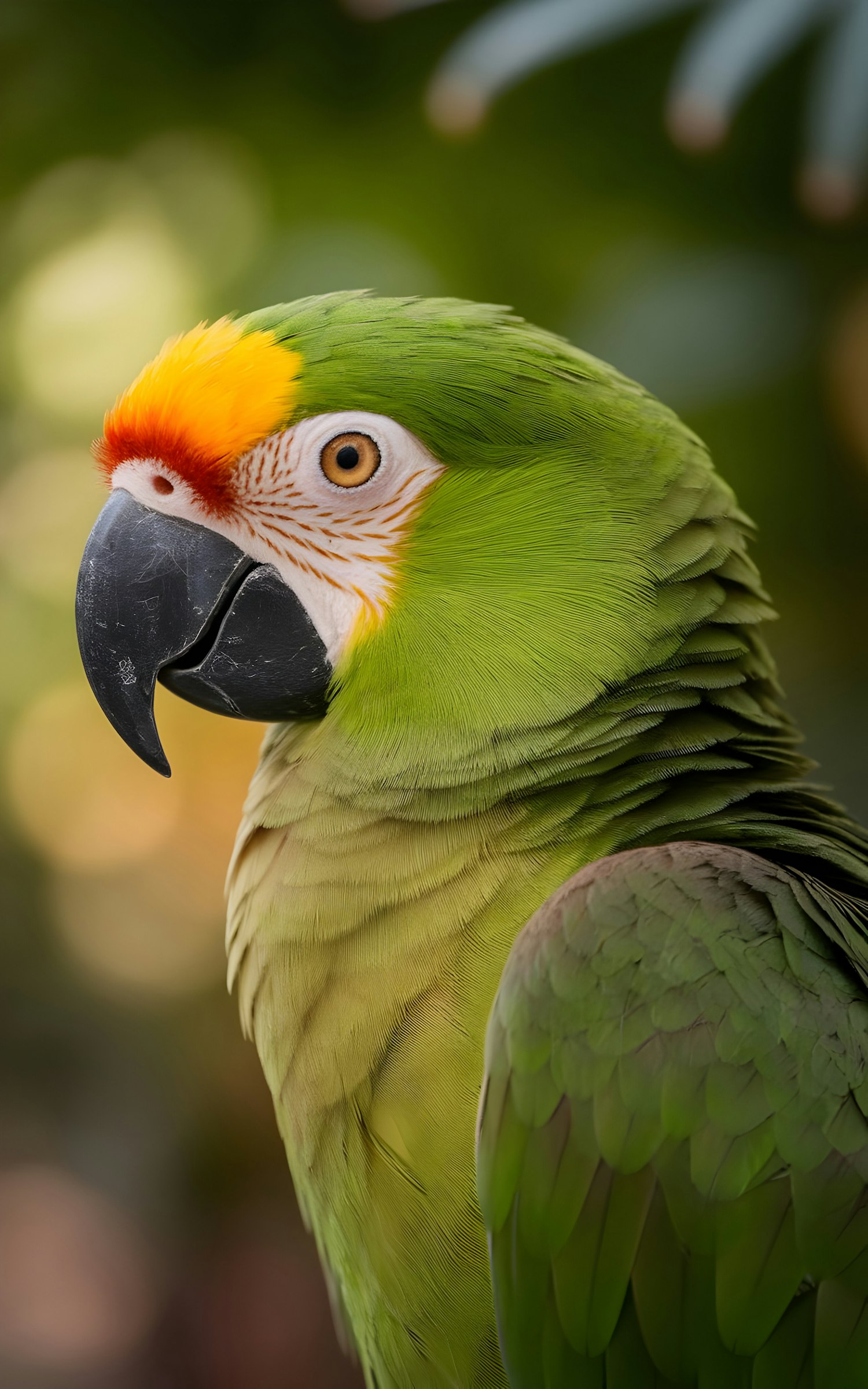 Close-up of a green parrot with yellow and orange head markings, detailed feathers, and a sharp black beak against a blurred natural background.