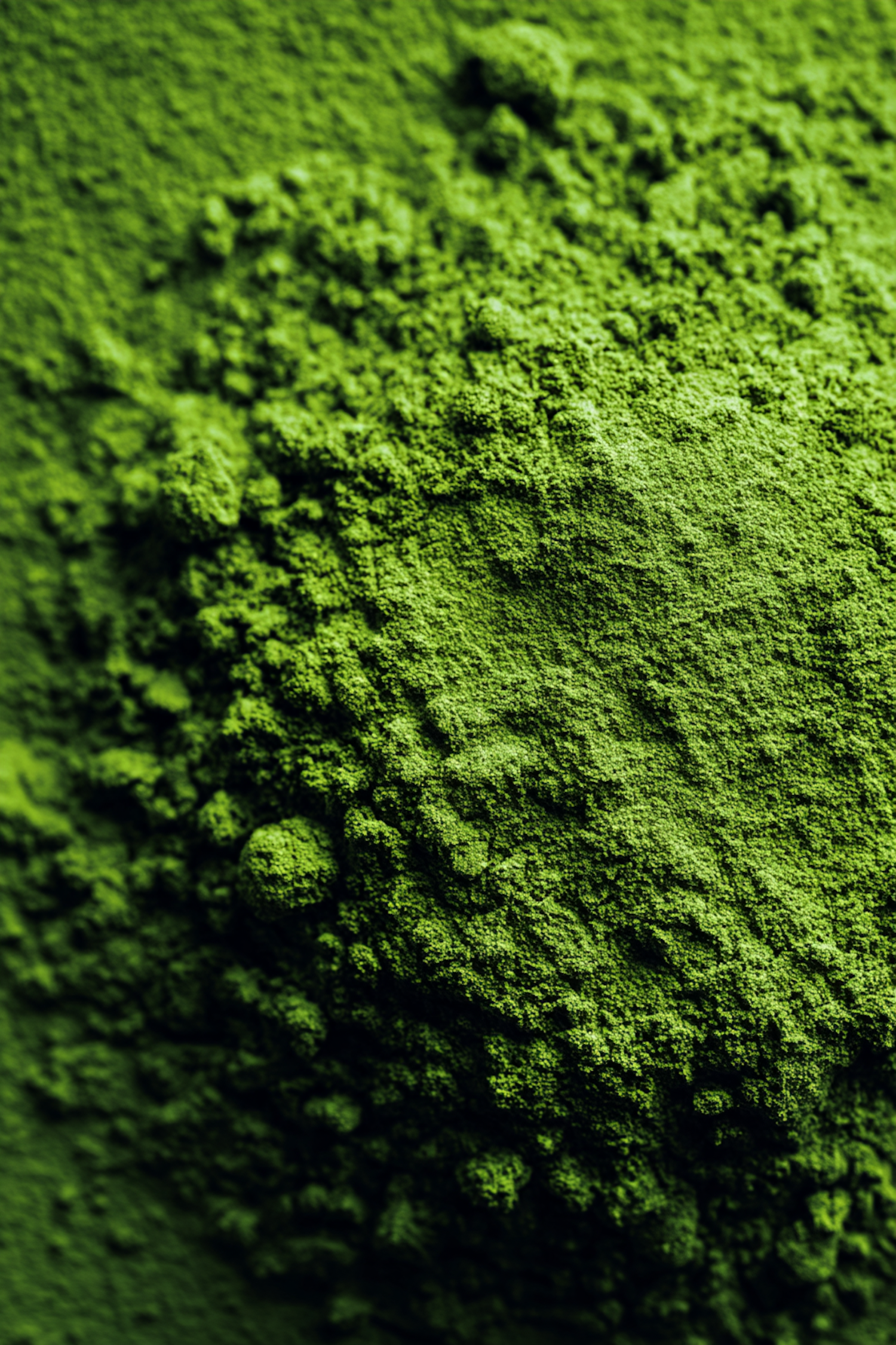 Close-up of vibrant green powder, showcasing its fine texture and rich color, likely matcha or a similar substance.