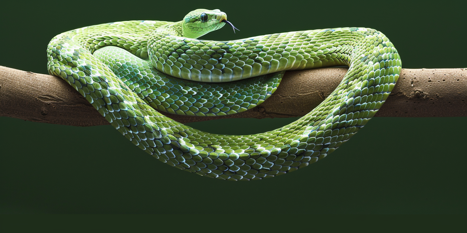 A vibrant green snake coiled on a branch against a deep green background, showcasing its vivid scales and alert posture.
