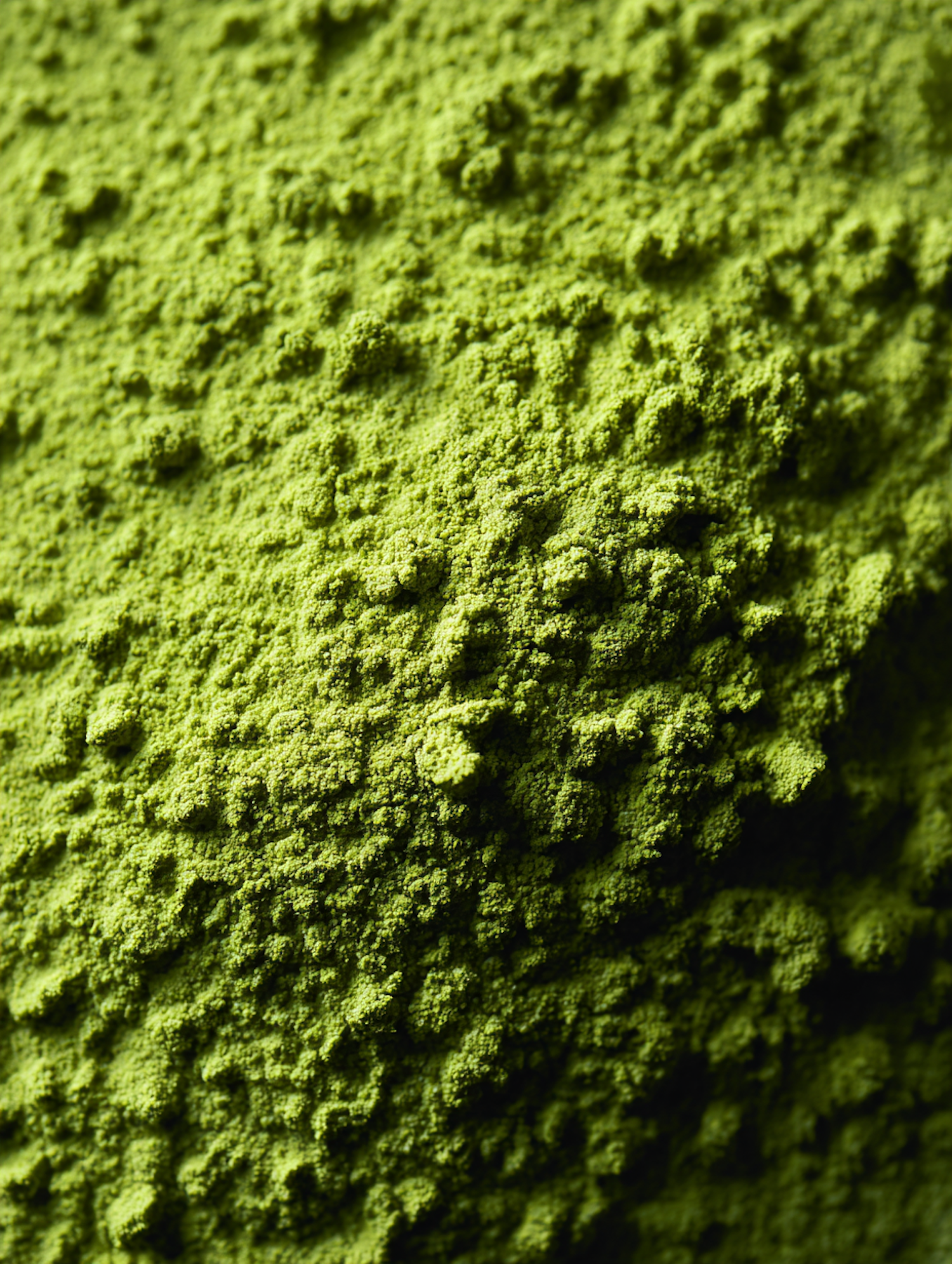 Close-up of vibrant green matcha powder, showcasing its fine texture and rich color, perfect for tea or culinary uses.