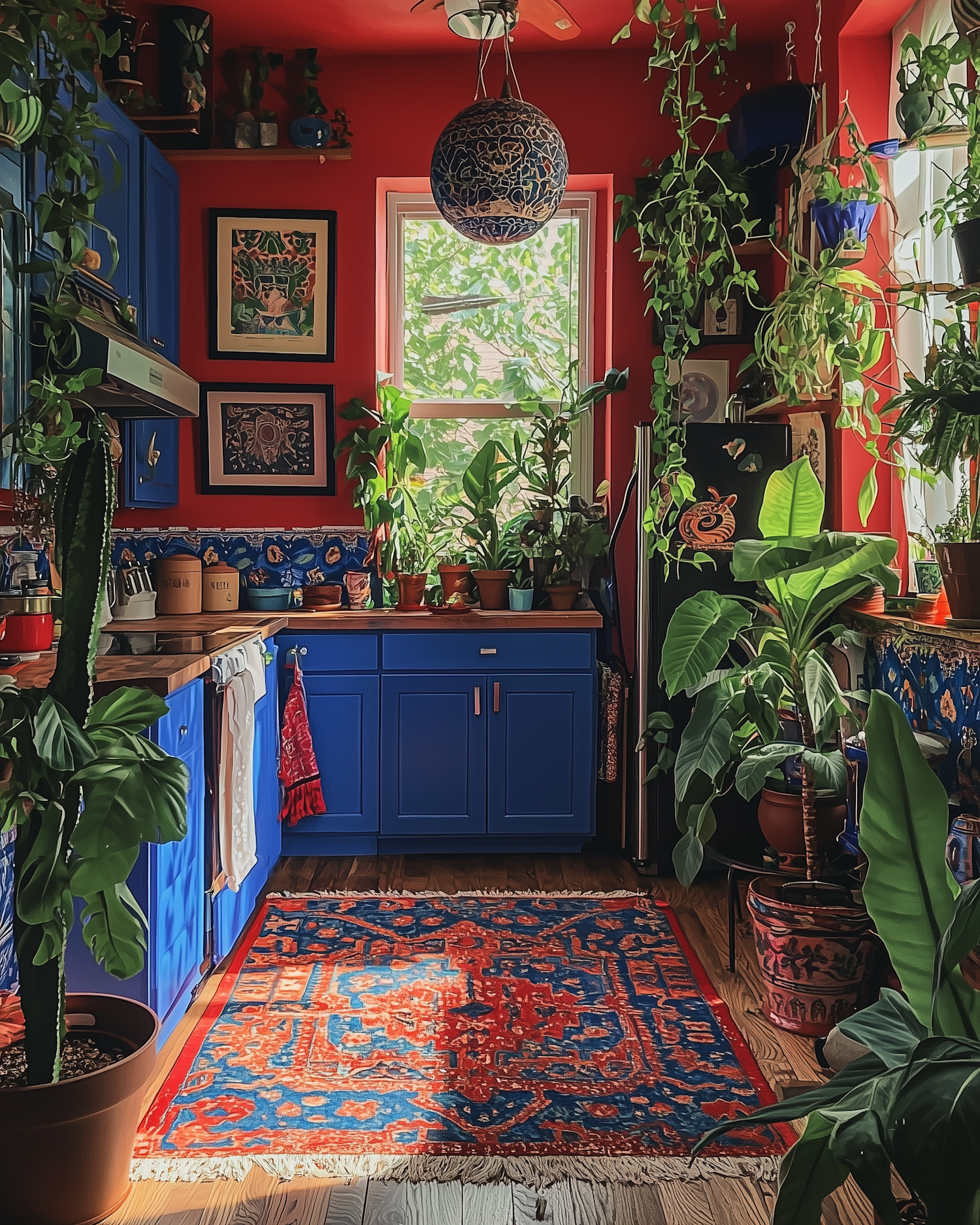 Bright red and blue kitchen with lush plants, wooden countertops, and a Persian-style rug. A cozy, vibrant space full of natural light.