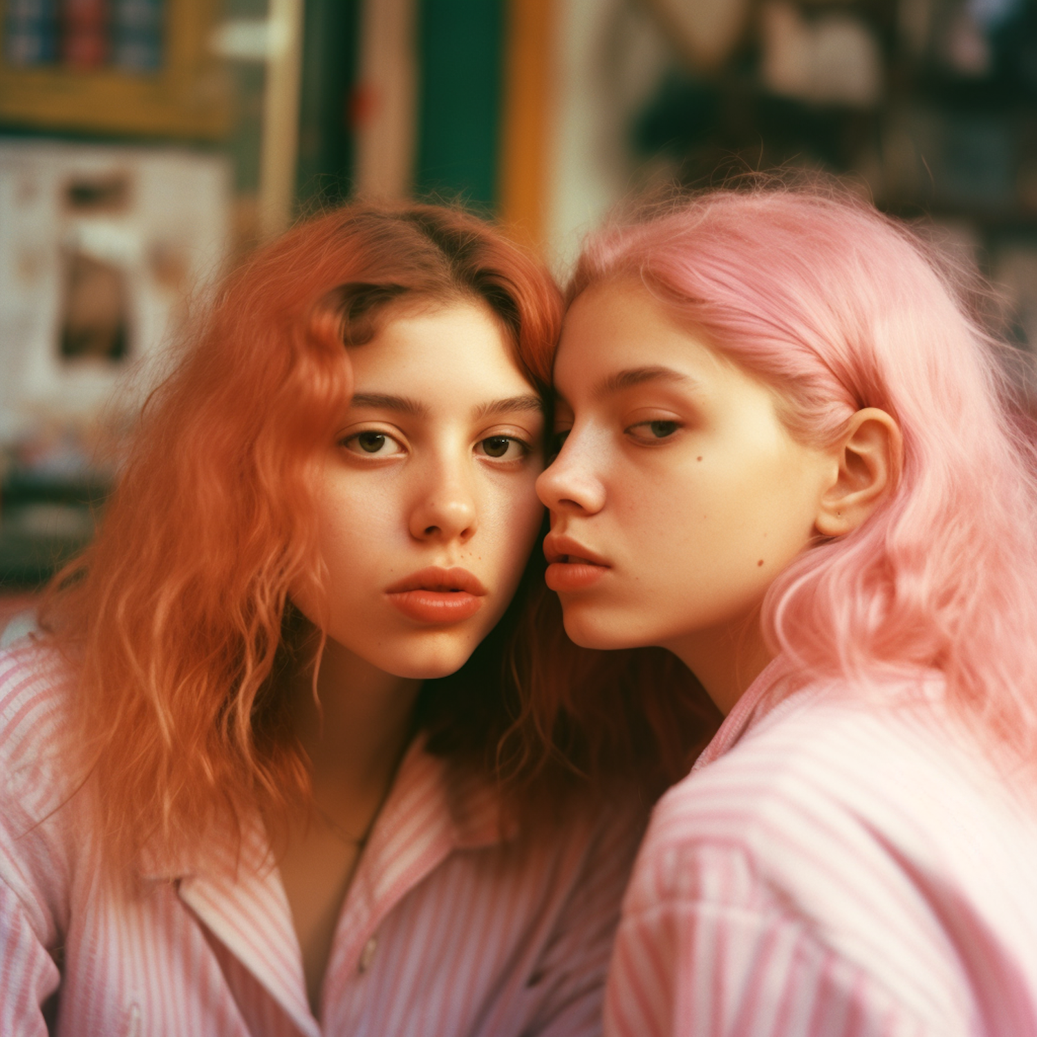 Two individuals with vibrant hair colors and matching striped shirts share a close, introspective moment in a softly lit indoor setting.