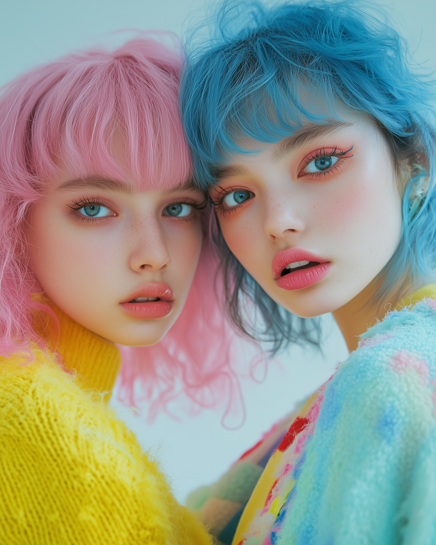 Two women with pastel pink and blue hair, bold makeup, and colorful outfits pose closely against a soft blue background.