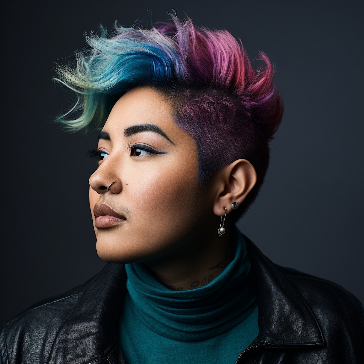 Portrait of a person with vibrant multicolored hair, bold makeup, and edgy style wearing a teal turtleneck and black leather jacket.