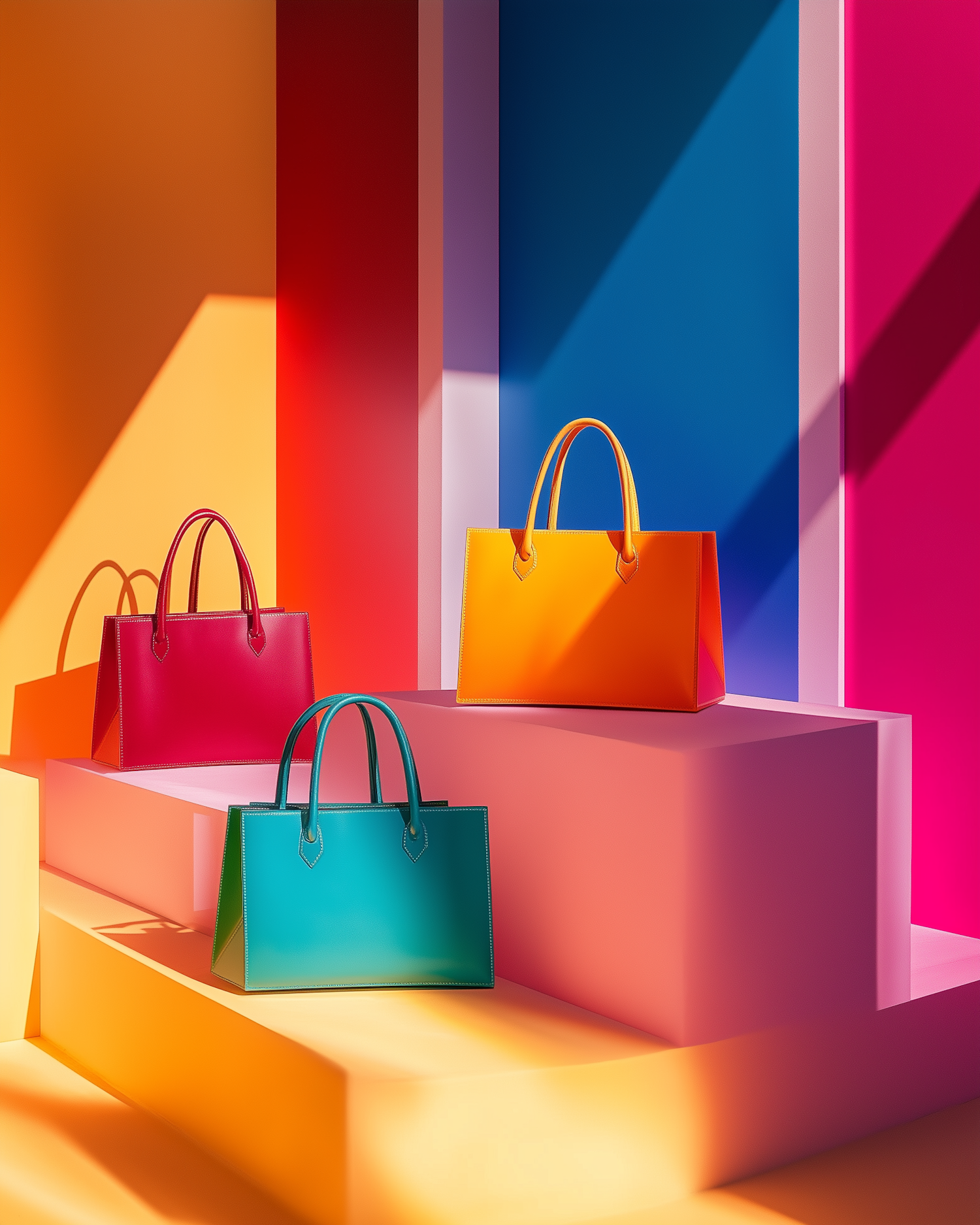 Bright handbags in red, yellow, and teal on colorful platforms with bold lighting and a vibrant geometric background.
