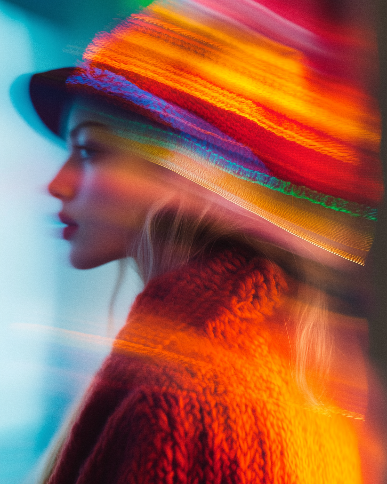 Artistic portrait with vibrant colors and motion blur, featuring a person in a colorful knit hat and red sweater against a blue background.